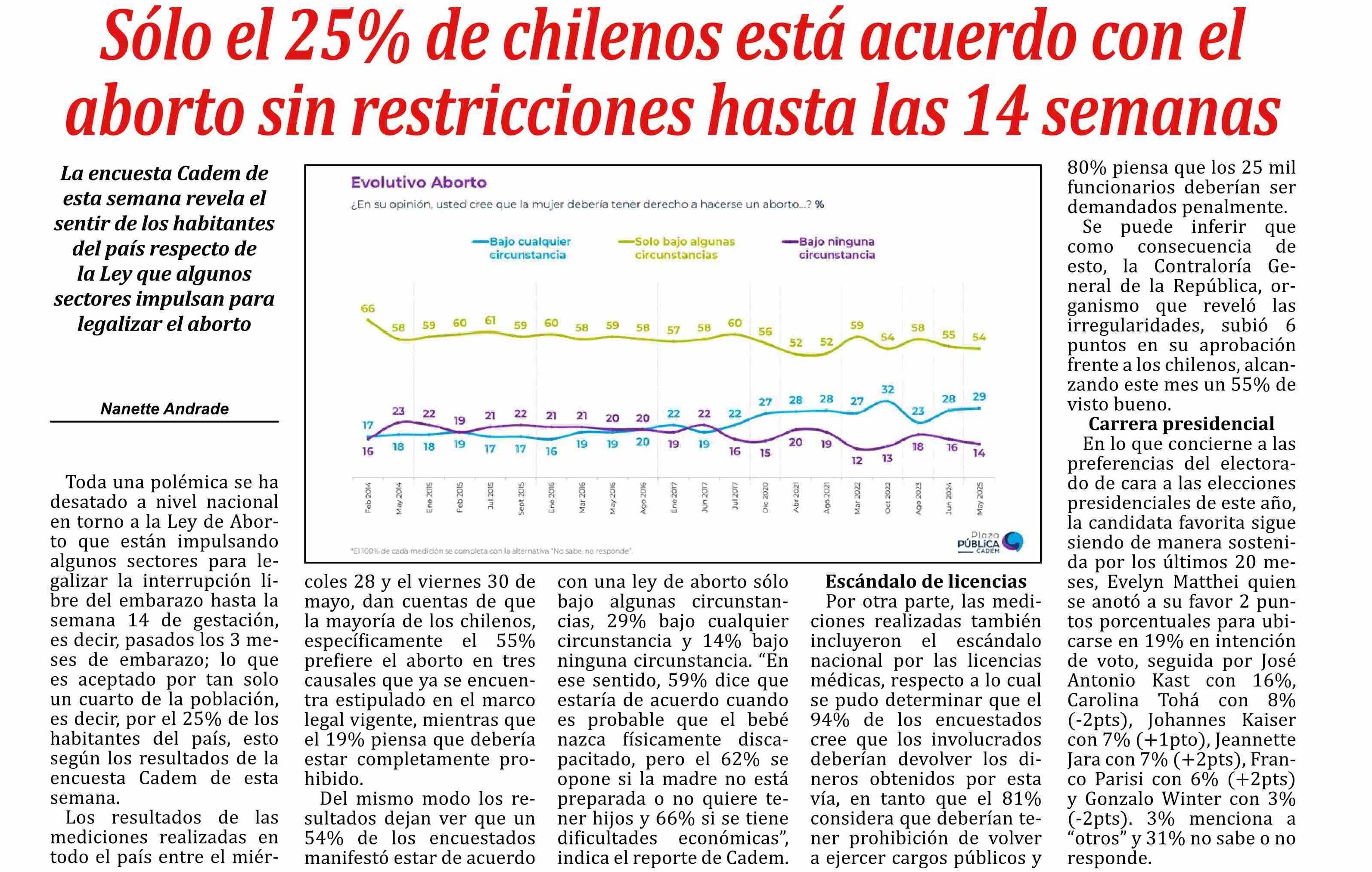 Sólo el 25% de chilenos está acuerdo con el aborto sin restricciones hasta las 14 semanas 05-06-2025 Las Noticias |