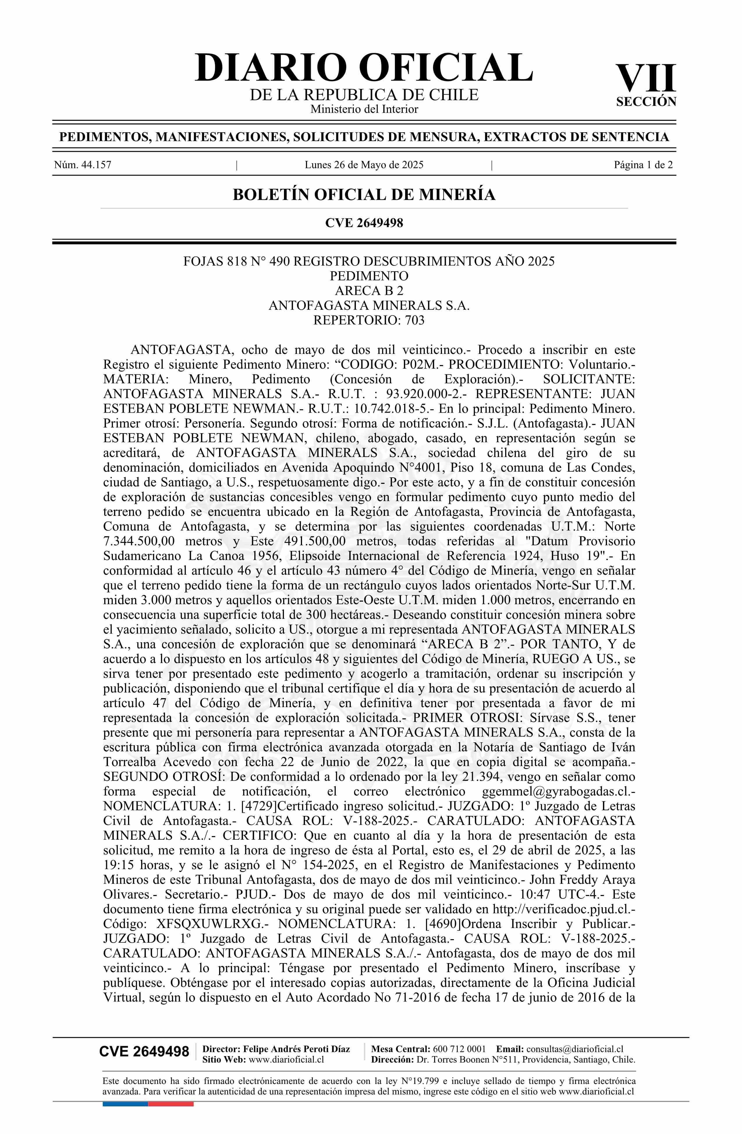 ARECA B 2 / Antofagasta Minerals S.A. 26-05-2025 DIARIO OFICIAL CHILE - BOLETÍN OFICIAL DE MINERÍA |