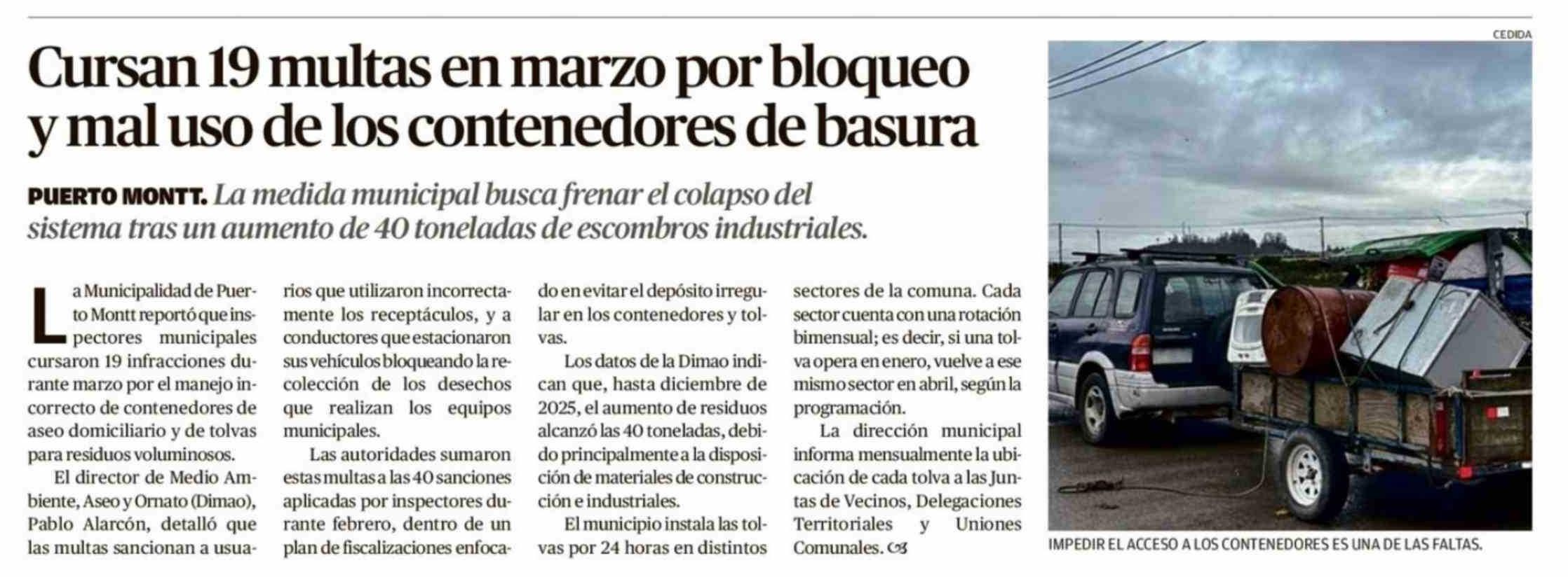 Cursan 19 multas en marzo por bloqueo y mal uso de los contenedores de basura 08-04-2026 El Llanquihue |