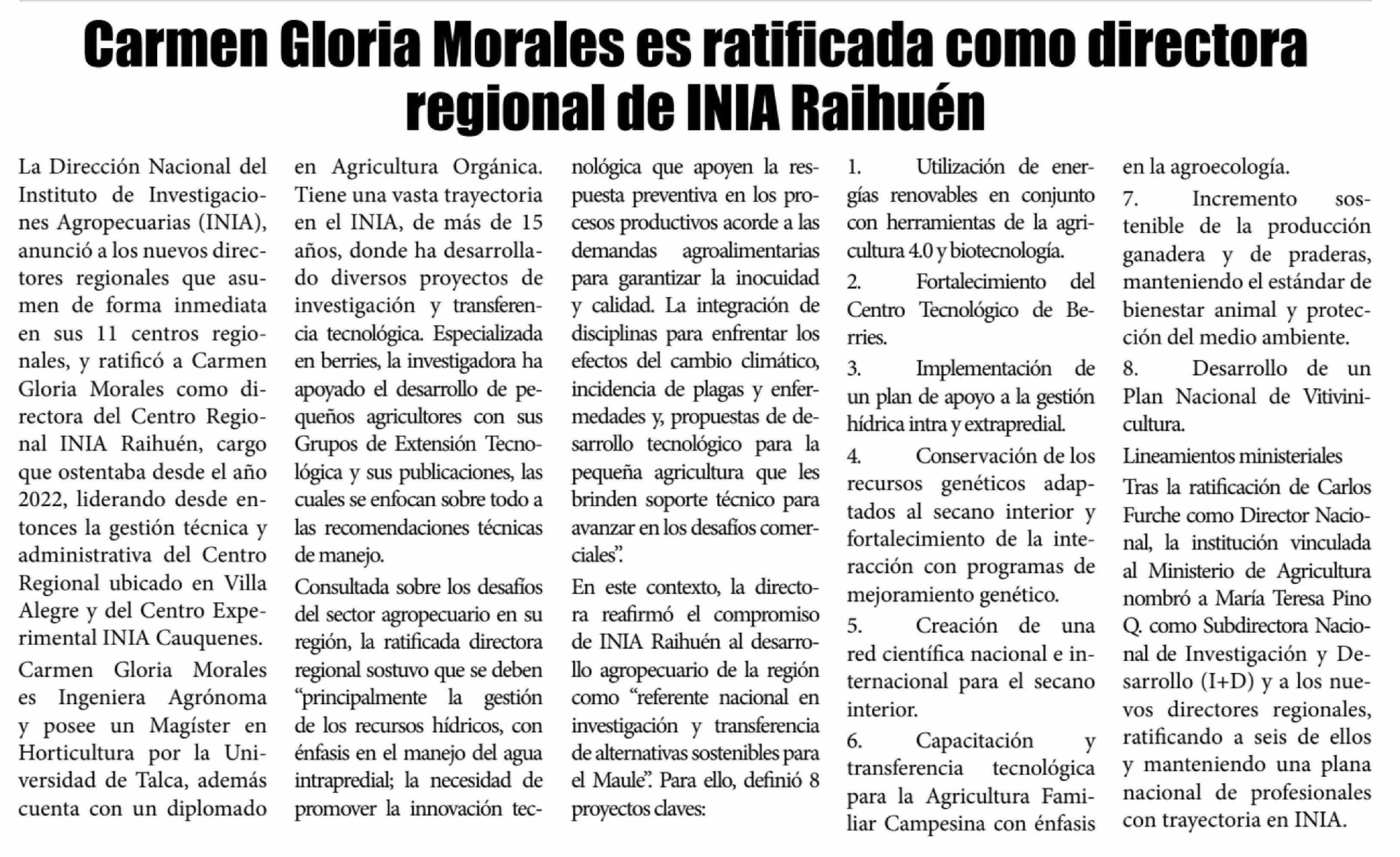 Carmen Gloria Morales es ratificada como directora regional de INIA Raihuén 15-04-2026 El Lector |