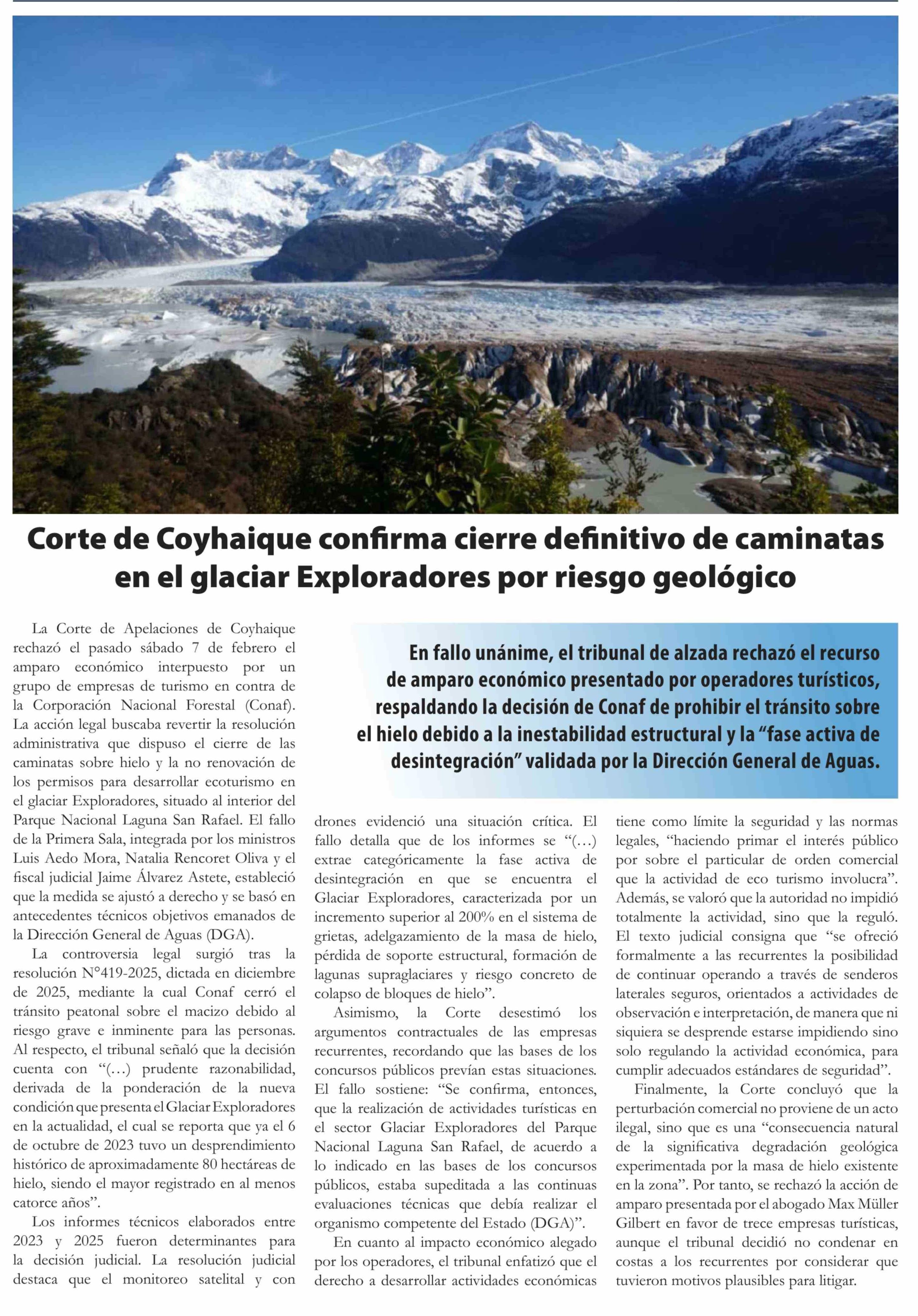 | Título: | Corte de Coyhaique confirma cierre definitivo de caminatas en el glaciar Exploradores por riesgo geológico |
