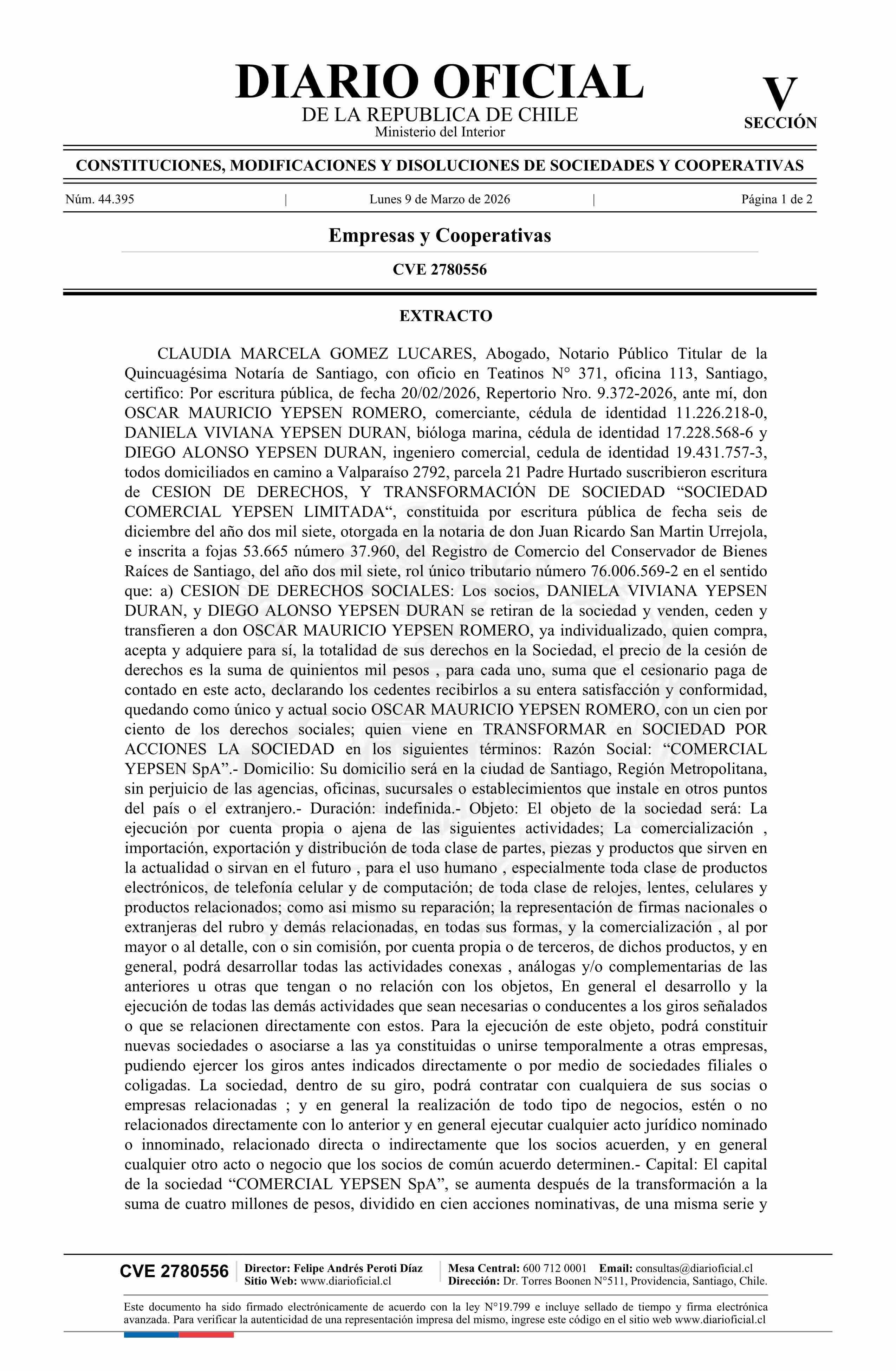 Título: SOCIEDAD COMERCIAL YEPSEN LIMITADA 76.006.569-2*