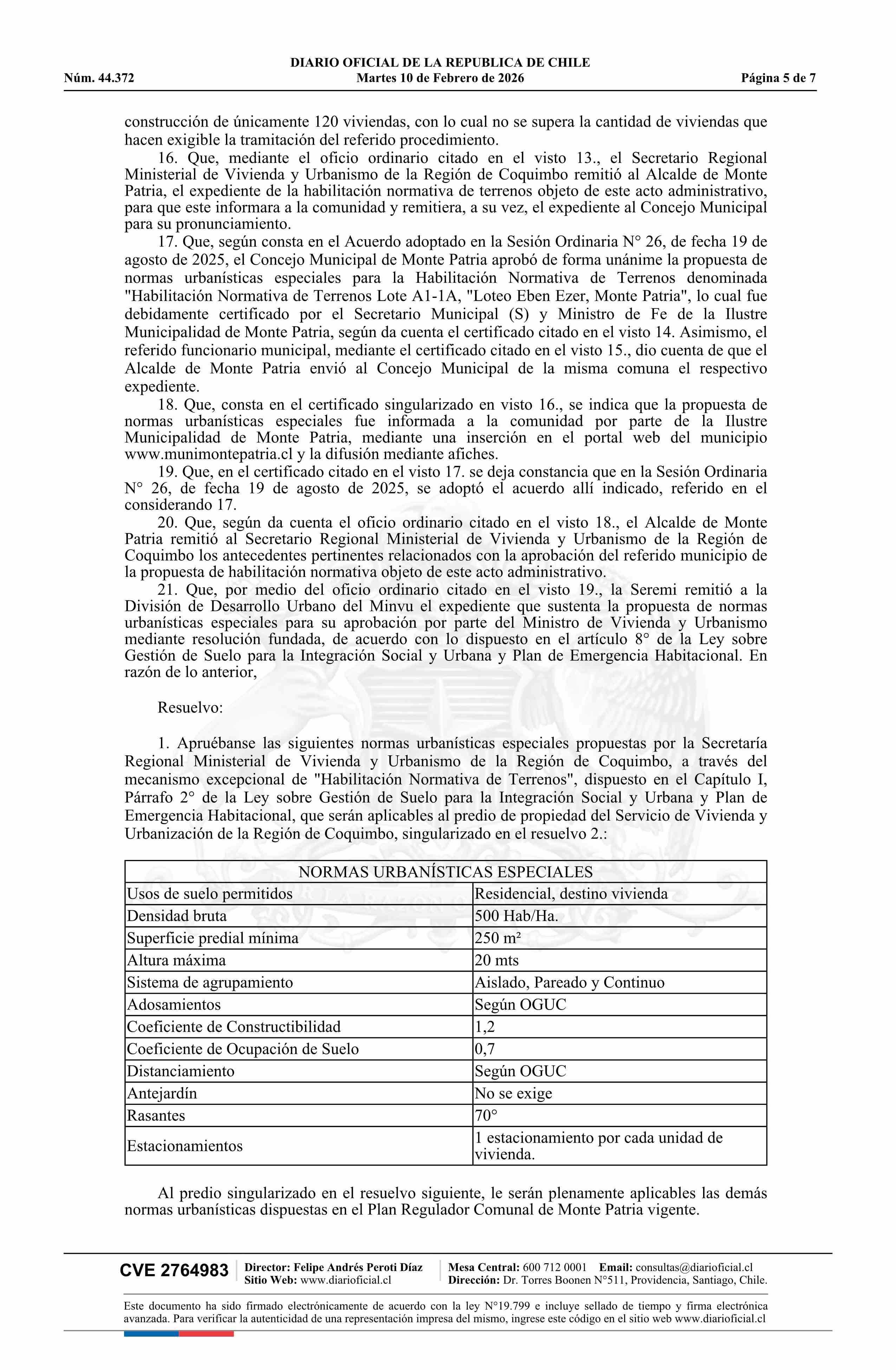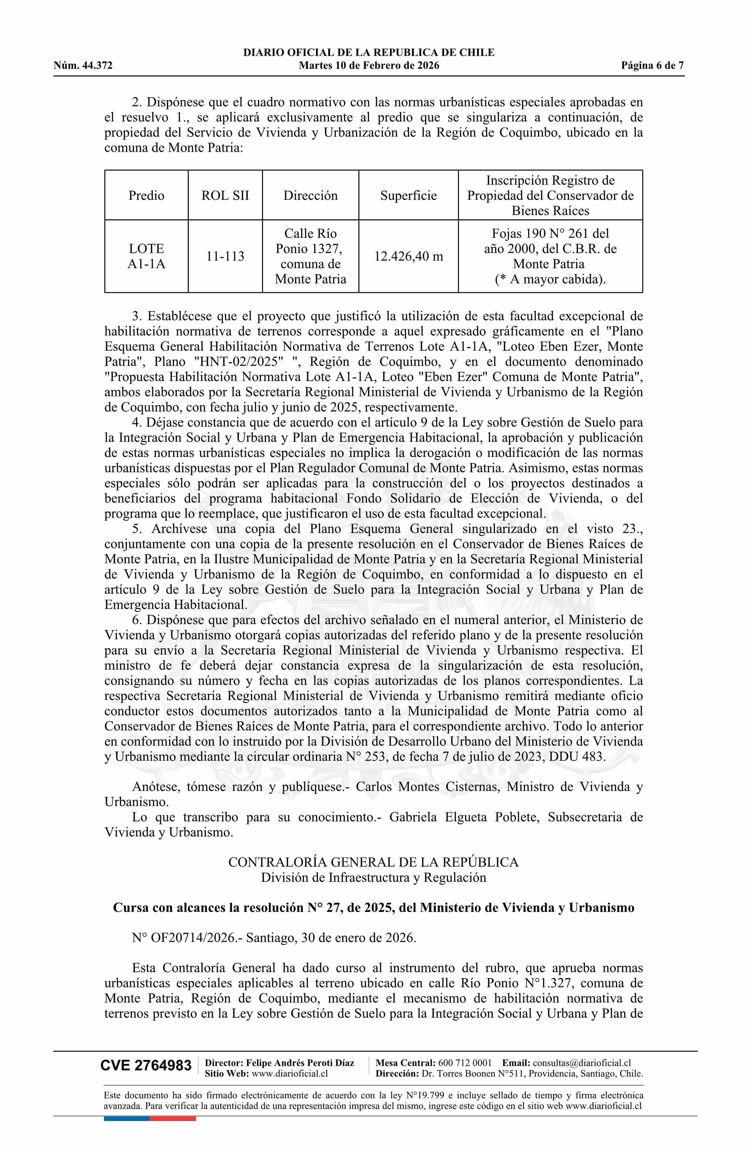 | Título: | Resolución número 27, de 2025.- Aprueba normas urbanísticas especiales aplicables al terreno ubicado en calle Río Ponio N° 1.327, comuna de Monte Patria, Región de Coquimbo, en el marco del artículo cuarto de la ley N° 21.450, que aprueba la Ley sobre Gestión de Suelo para la Integración Social y Ur |