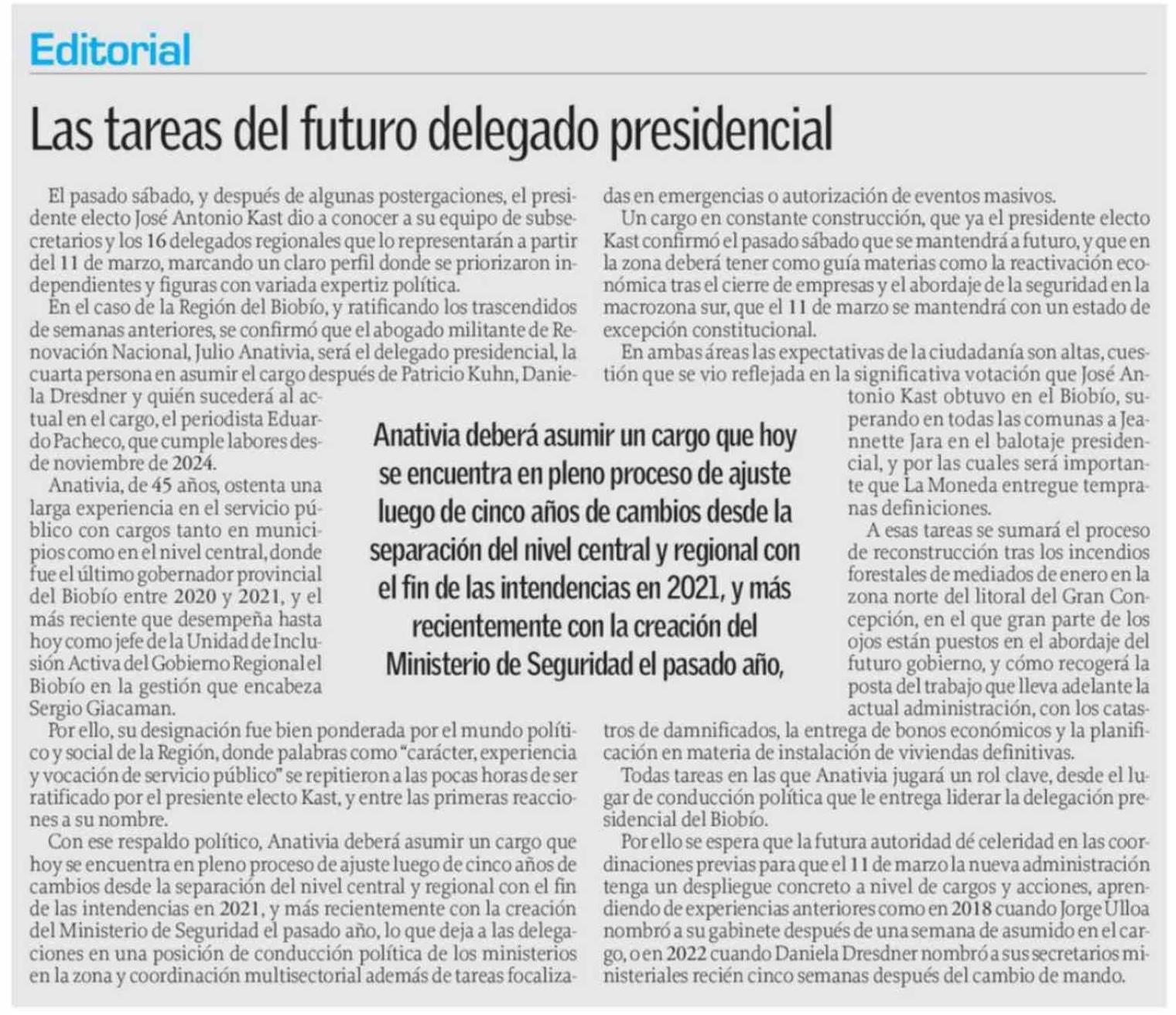 Editorial: Las tareas del futuro delegado presidencial 10-02-2026 El Sur |