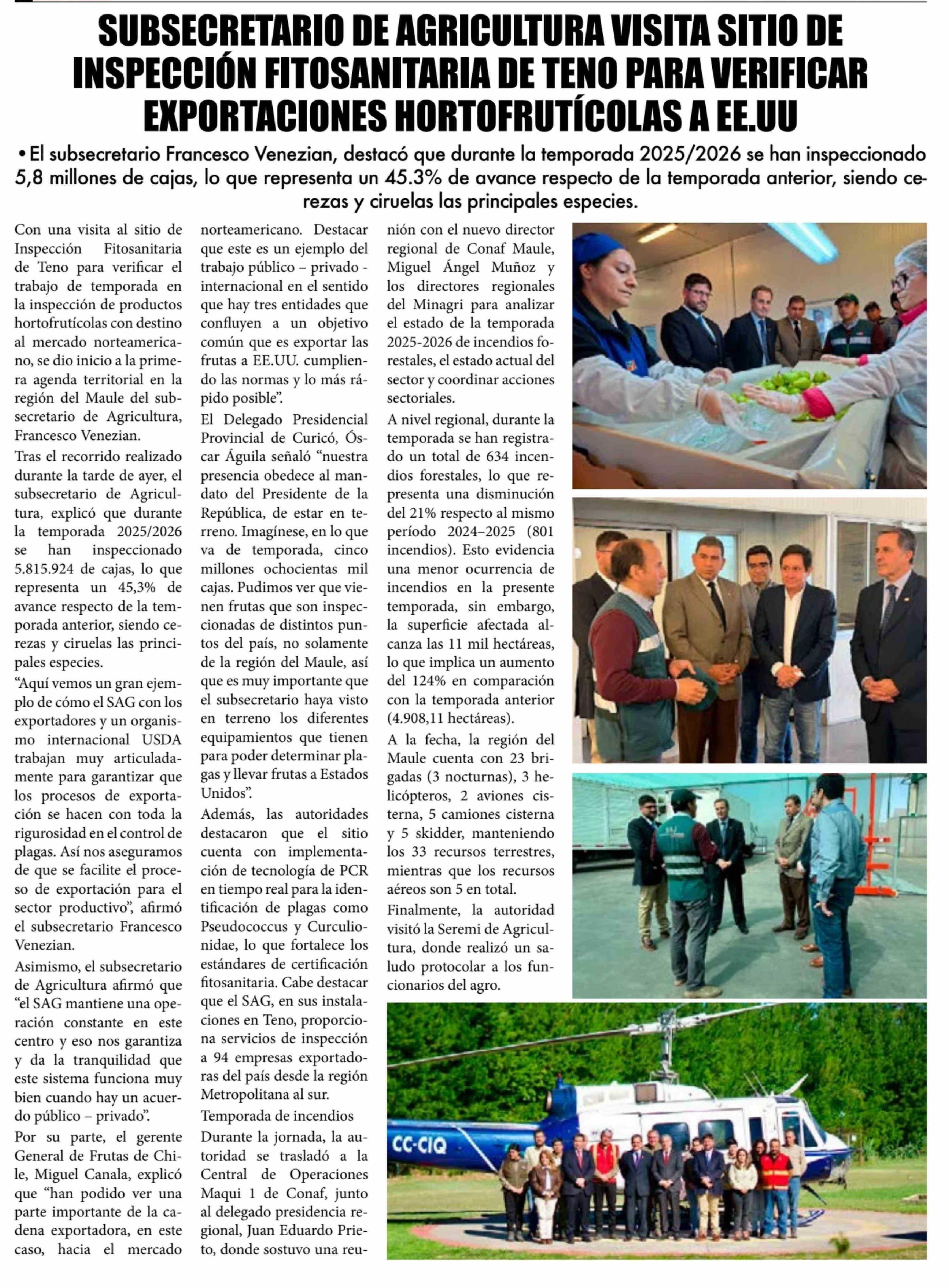 SUBSECRETARIO DE AGRICULTURA VISITA SITIO DE INSPECCIÓN FITOSANITARIA DE TENO PARA VERIFICAR EXPORTACIONES HORTOFRUTÍCOLAS A EE.UU 27-03-2026 El Lector |