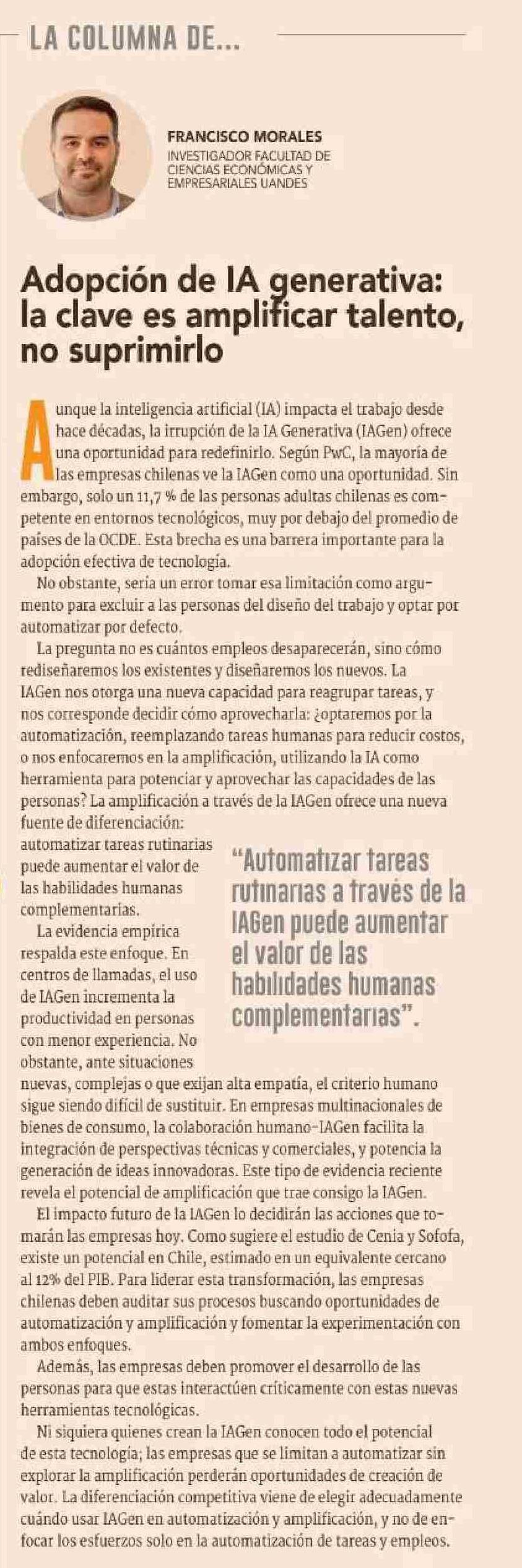 COLUMNAS DE OPINIÓN: Adopción de lA generativa: la clave es amplificar talento, no suprimirlo 16-05-2025 Diario Financiero |
