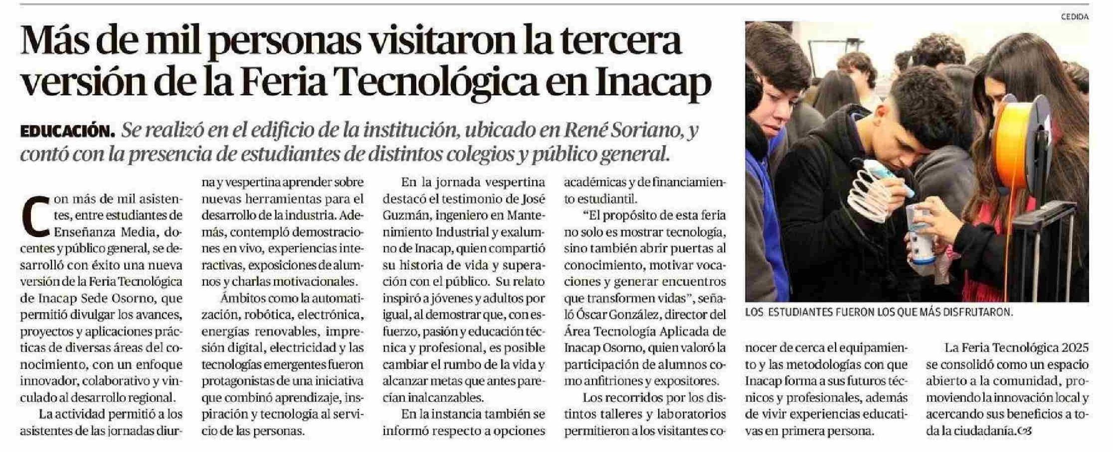 Más de mil personas visitaron la tercera versión de la Feria Tecnológica en Inacap 07-06-2025 El Austral de Osorno |