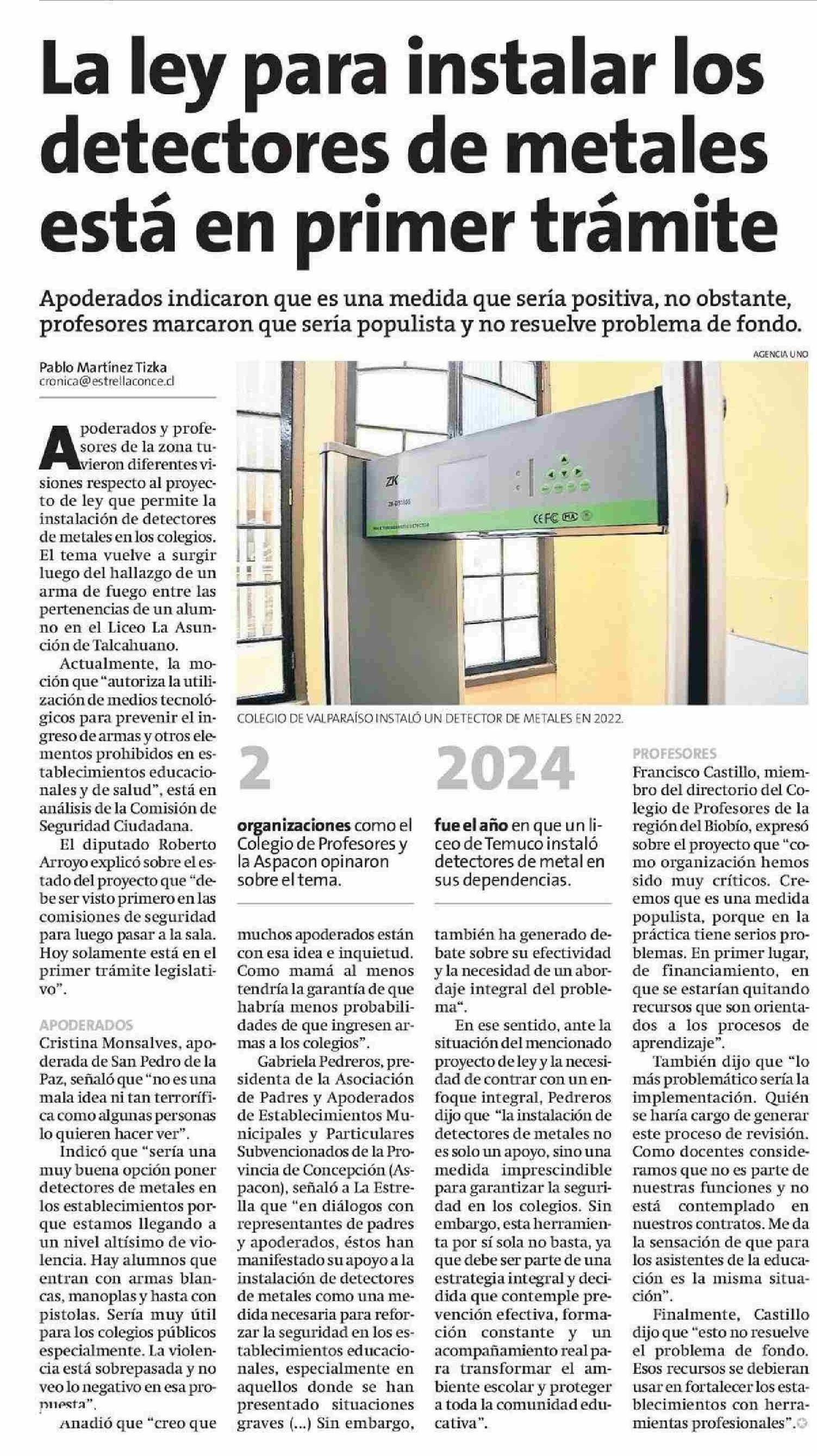 La ley para instalar los detectores de metales está en primer trámite 22-05-2025 La Estrella de Concepción |
