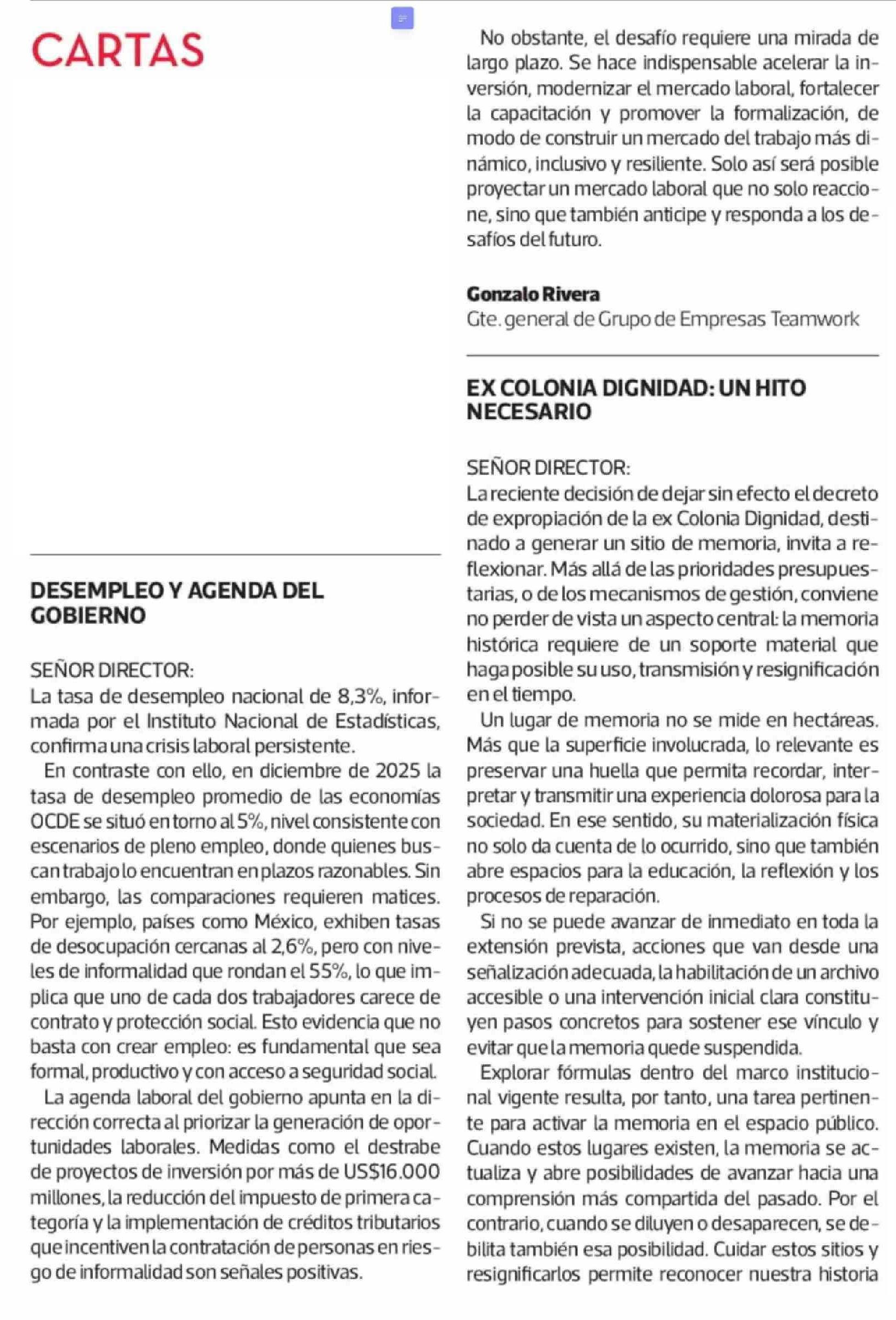 CARTAS: DESEMPLEO Y AGENDA DEL GOBIERNO 08-04-2026 La Tercera |