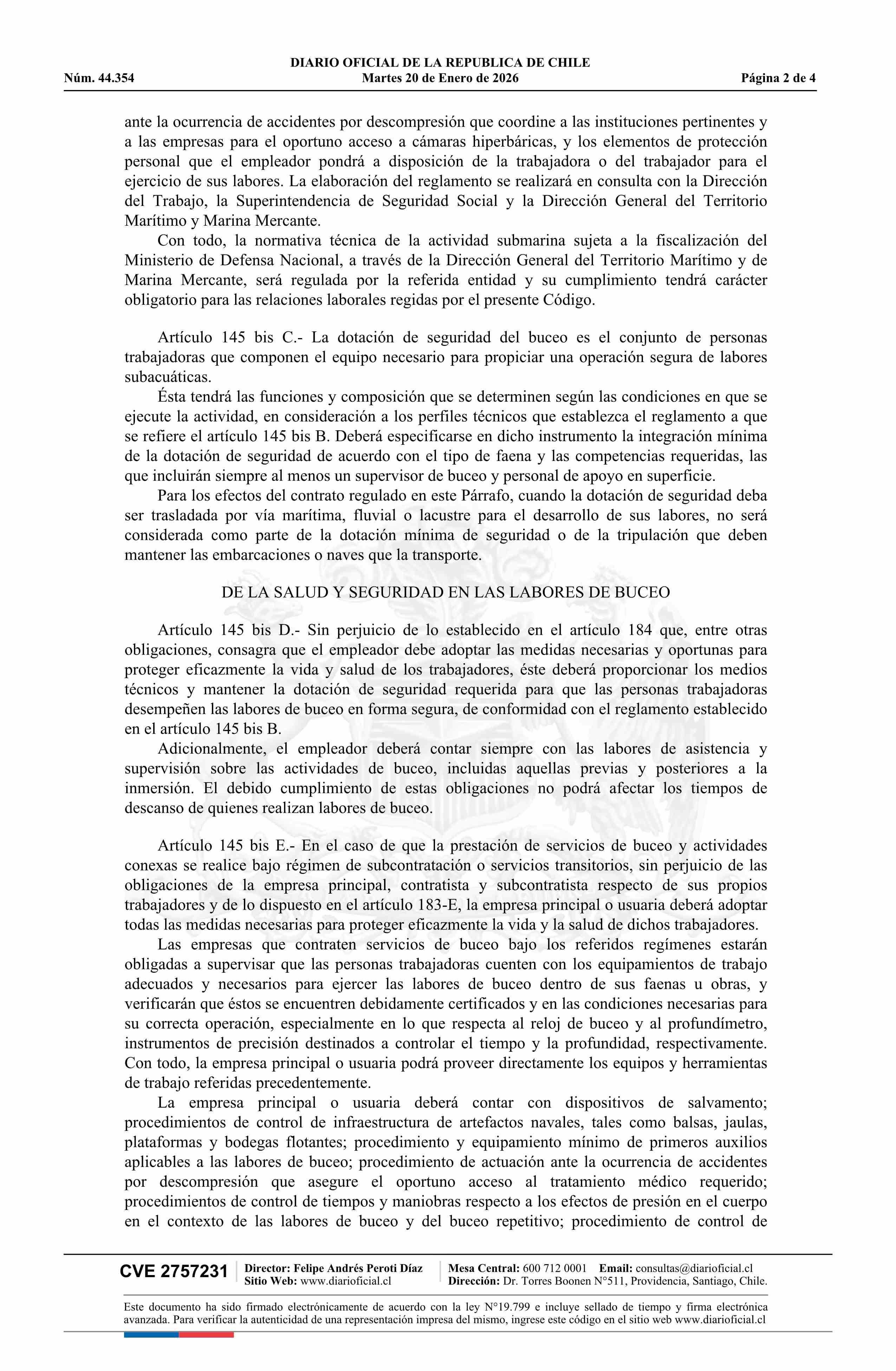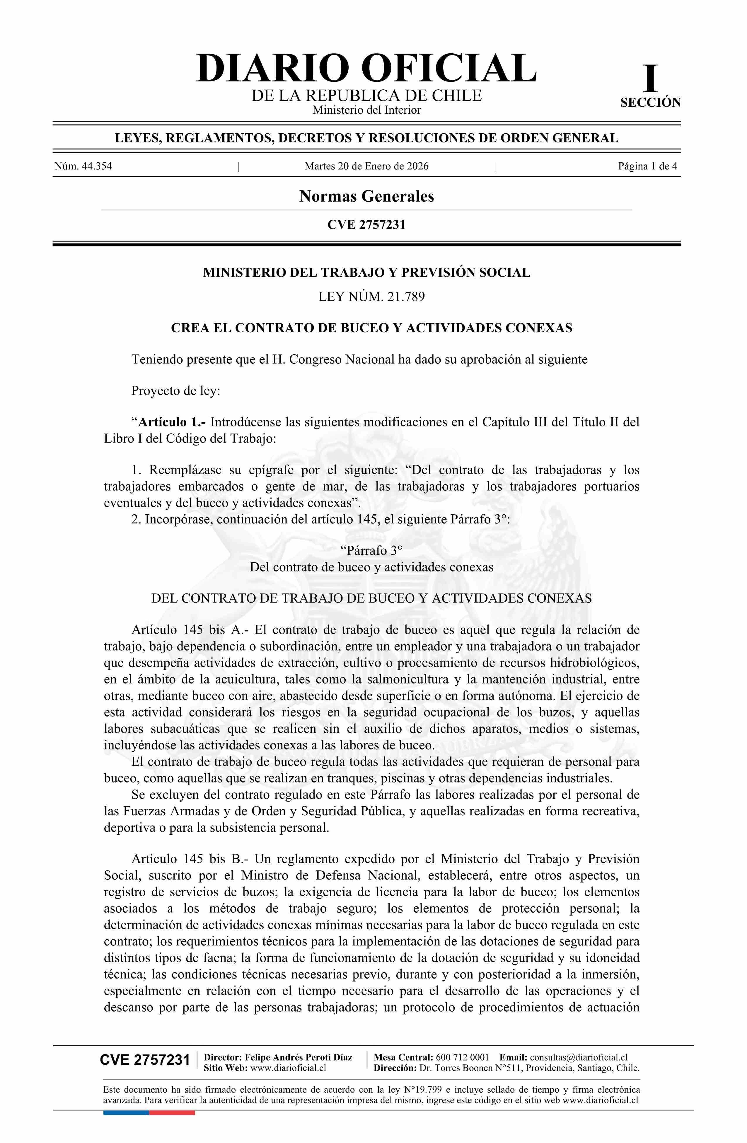 Ley número 21.789.- Crea el contrato de buceo y actividades conexas 20-01-2026 DIARIO OFICIAL CHILE - BOLETÍN OFICIAL DE MINERÍA |
