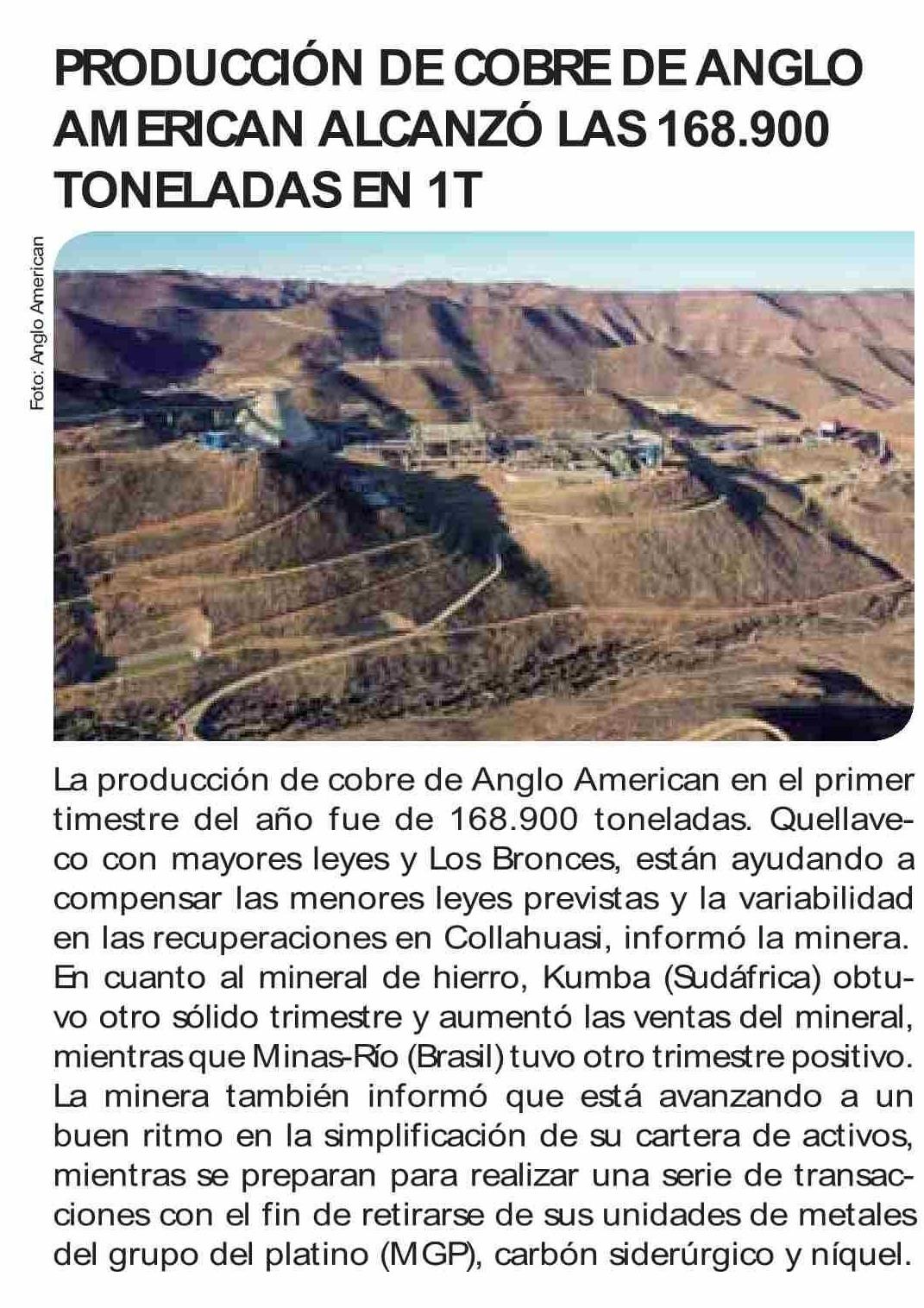 | Título: | PRODUCCÓN DE COBRE DE ANGLO AMERICAN ALCANZÓ LAS 168.900 TONELADAS EN IT |