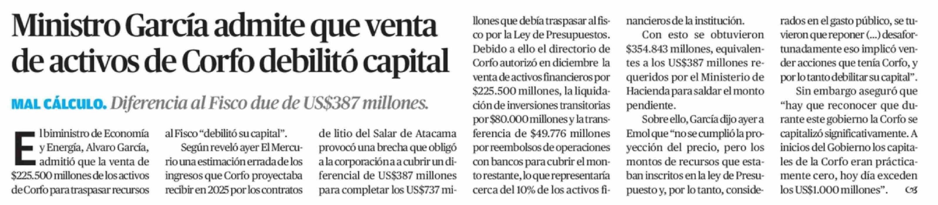 | Título: | Ministro García admite que venta de activos de Corfo debilitó capital |