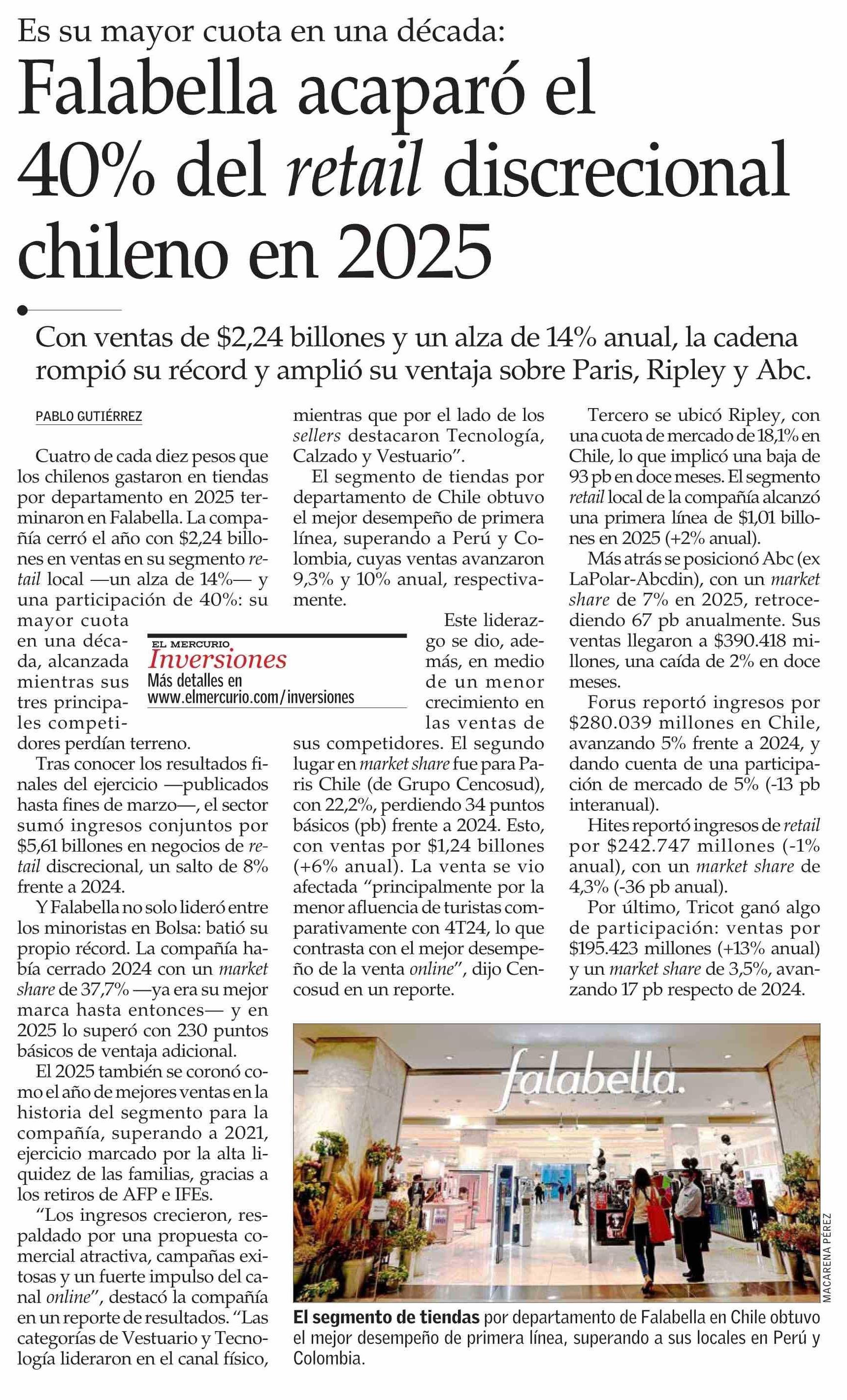 Título: Falabella acaparó el 40% del retail discrecional chileno en 2025