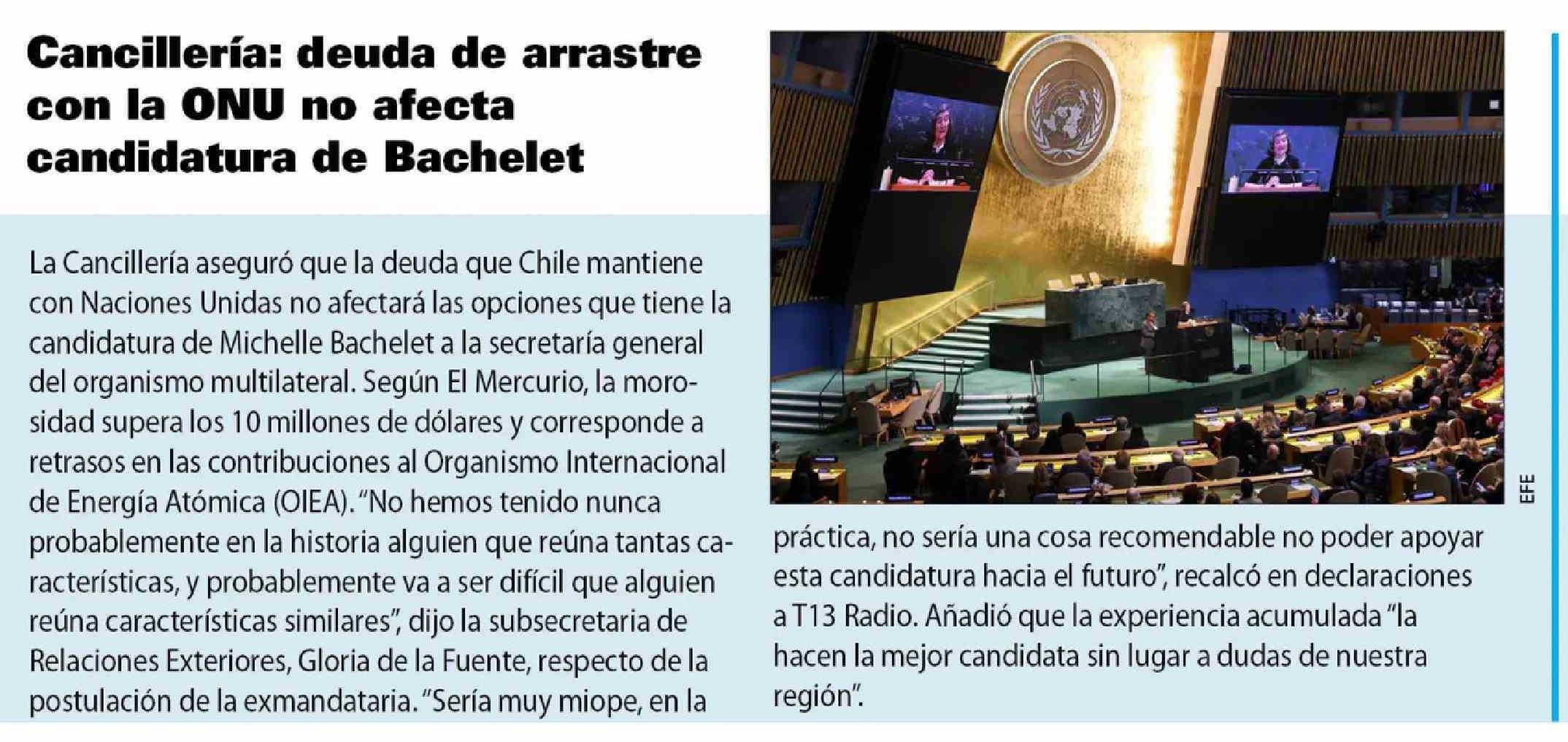 Título: Cancillería: deuda de arrastre con la ONU no afecta candidatura de Bachelet