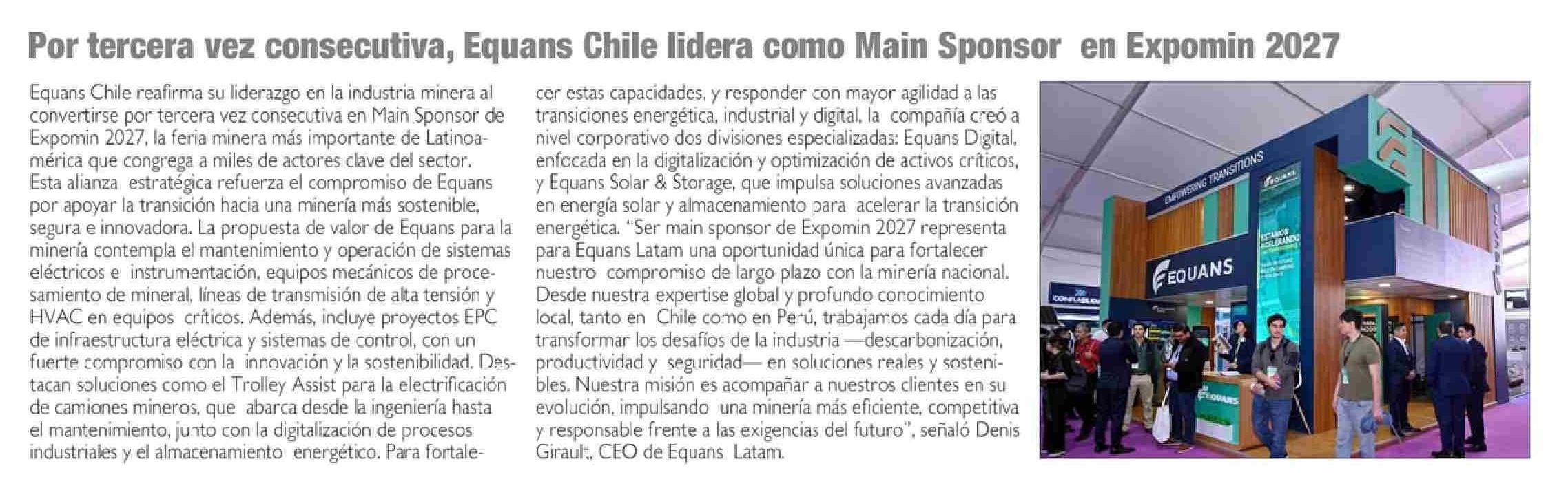 Título: Por tercera vez consecutiva, Equans Chile lidera como Main Sponsor en Expomin 2027