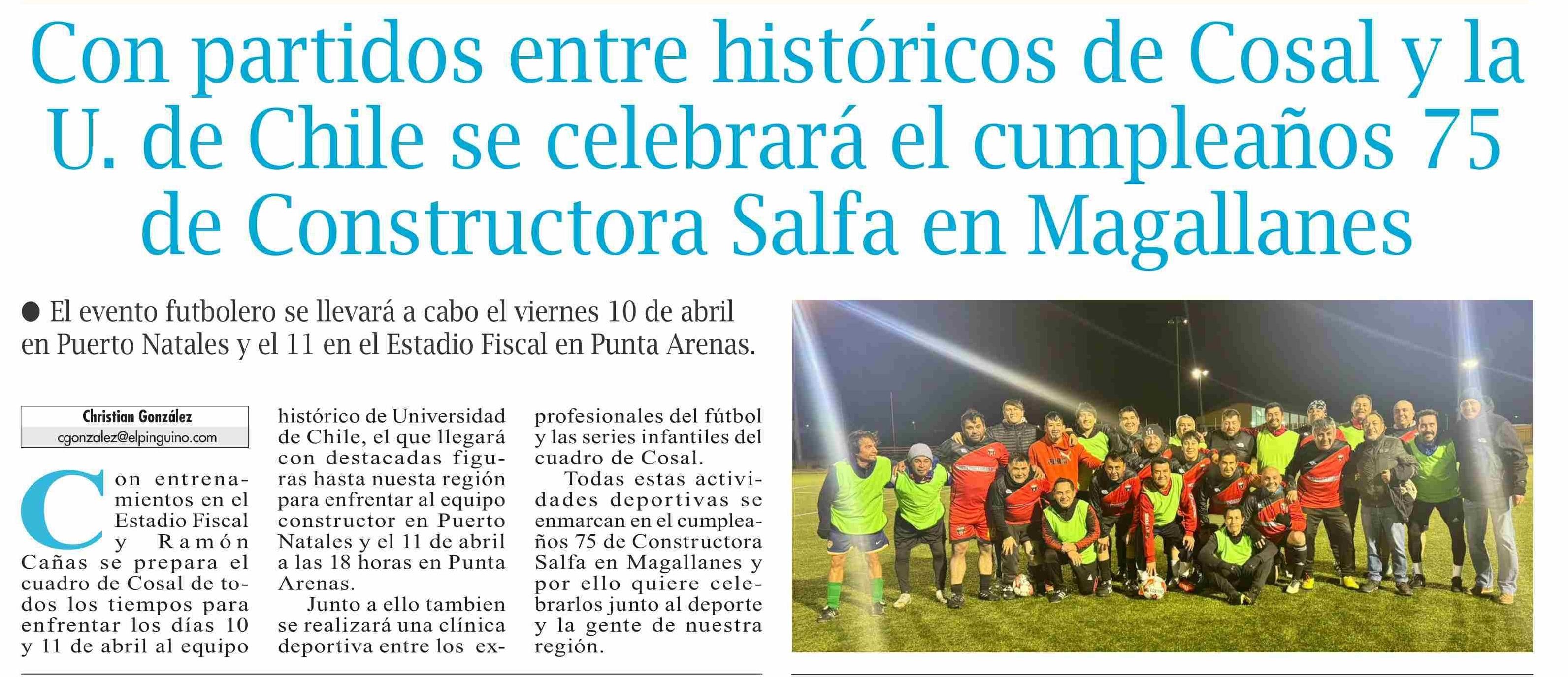 Con partidos entre históricos de Cosal y la U. de Chile se celebrará el cumpleaños 75 de Constructora Salfa en Magallanes 27-03-2026 El Pingüino |
