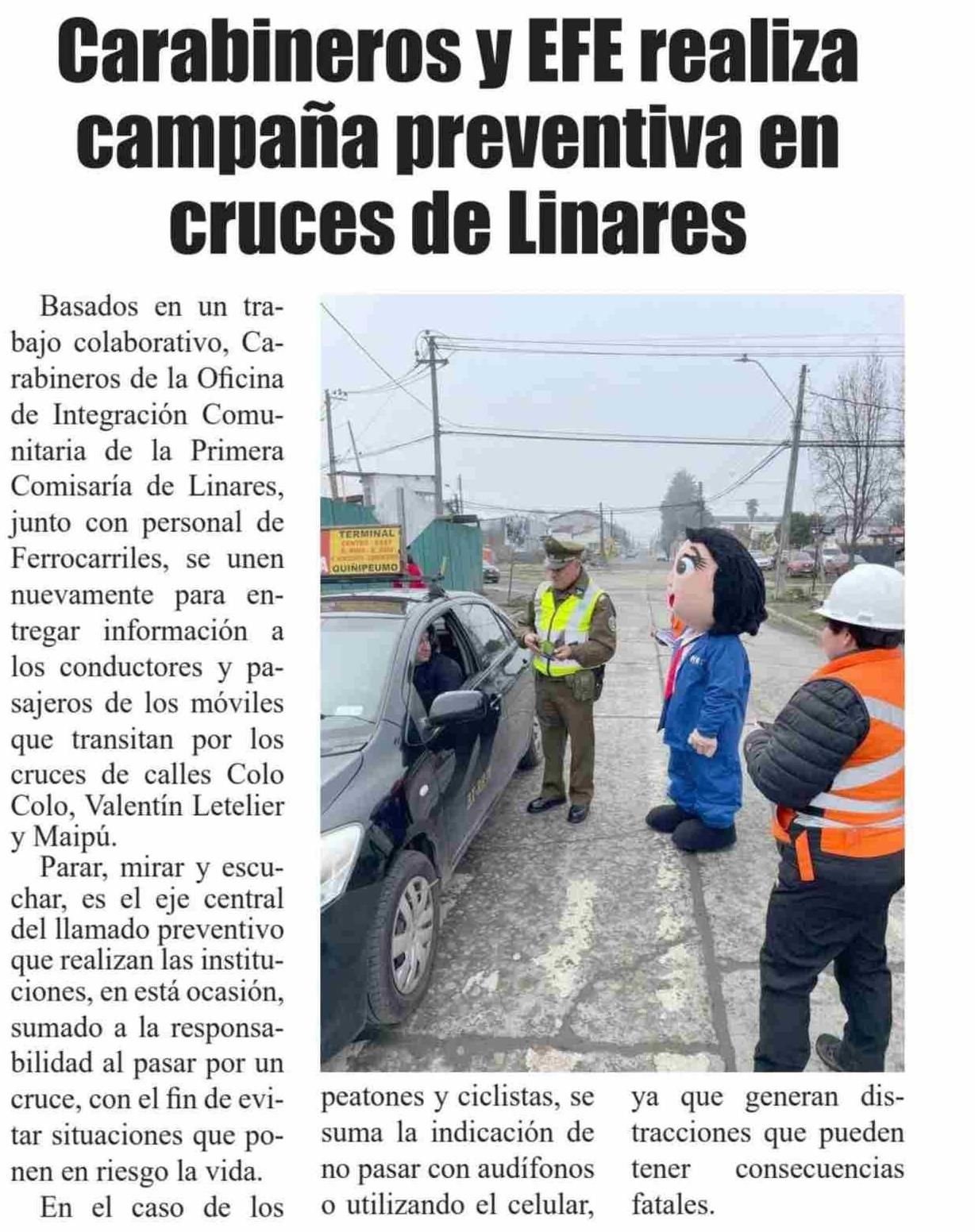 | Título: | Carabineros y EFE realiza campaña preventiva en cruces de Linares |