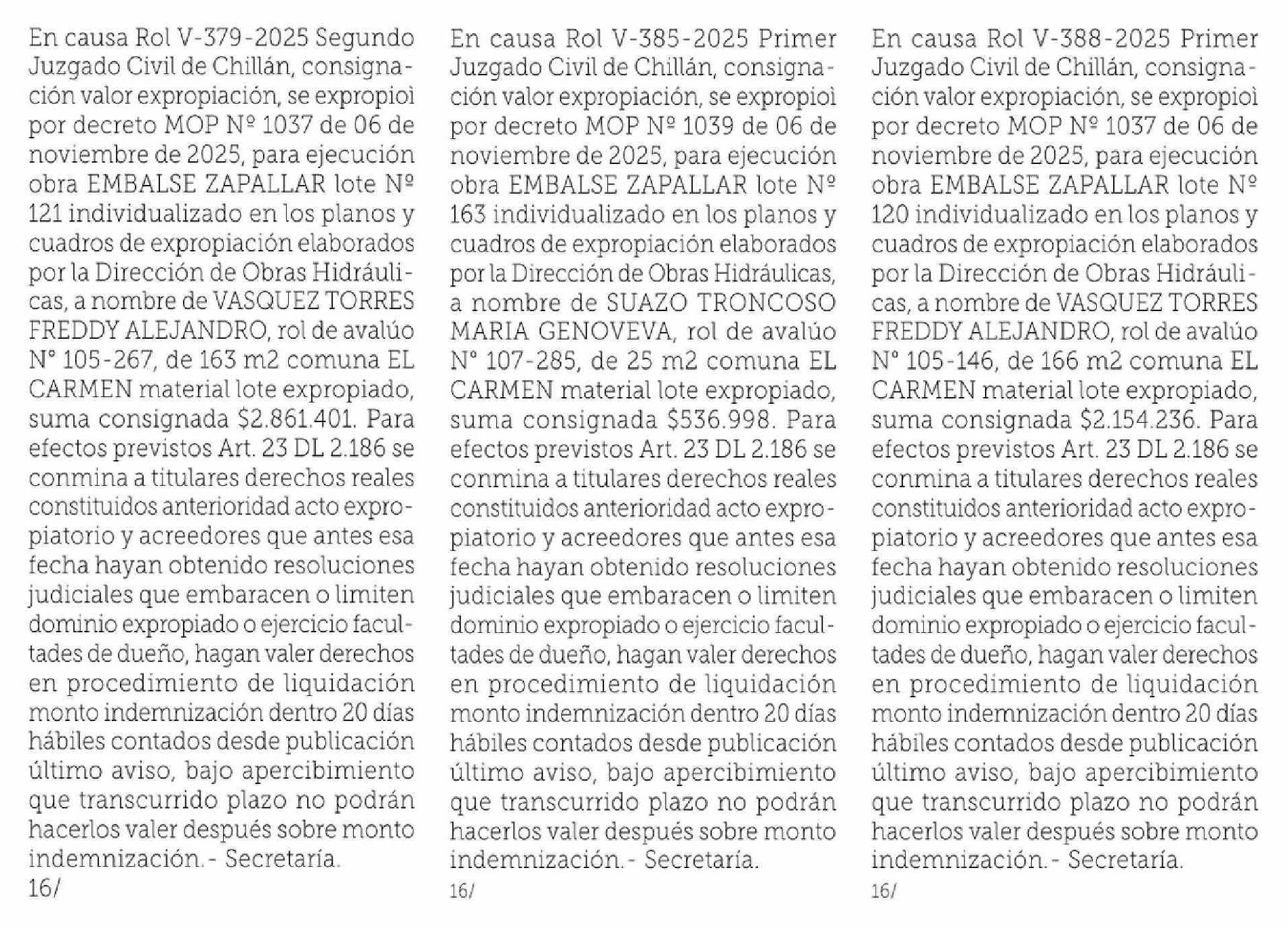 En causa Rol V-379-2025 Segundo Juzgado Civil de Chillán, consignación valor expropiación, se expropioì por decreto MOP Nº 1037 de 06 de noviembre de 2025, para ejecución obra EMBALSE ZAPALLAR lote Nº 121 individualizado en los planos y cuadros de expropiación elaborados por la Dirección de Obras Hi