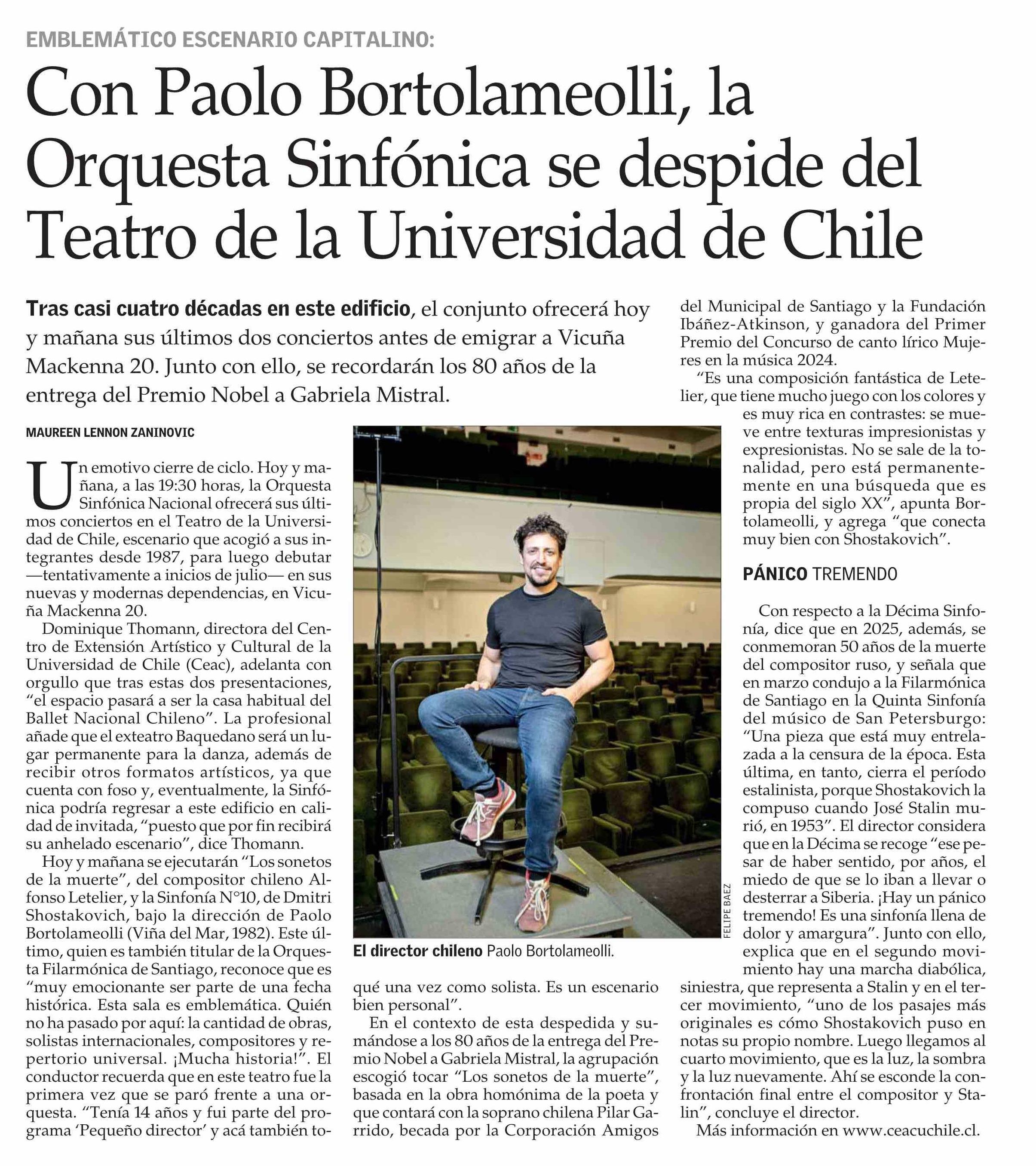 Con Paolo Bortolameolli, la Orquesta Sinfónica se despide del Teatro de la Universidad de Chile 30-05-2025 El Mercurio |