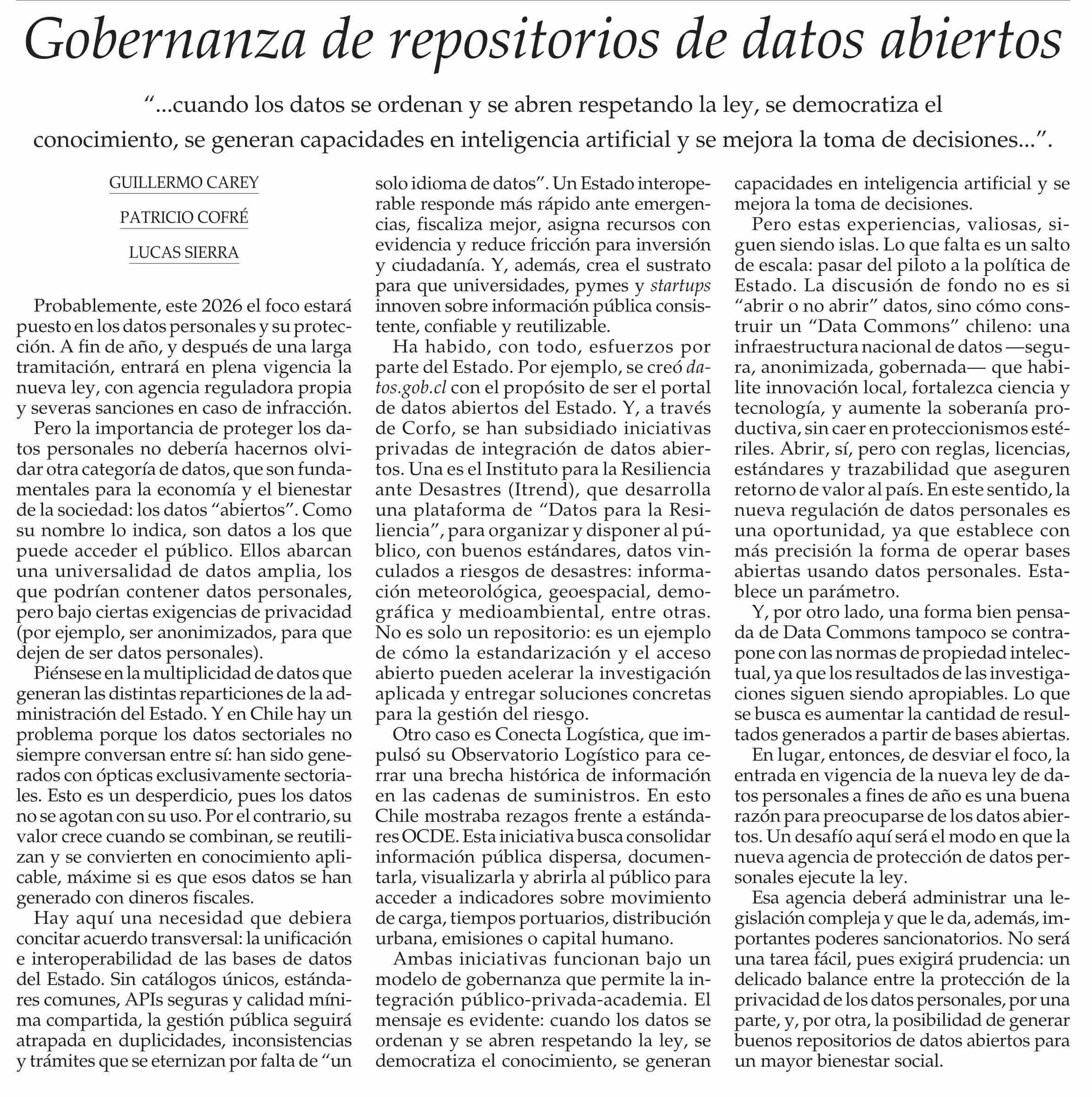 Columnas de Opinión: Gobernanza de repositorios de datos abiertos 23-02-2026 El Mercurio |