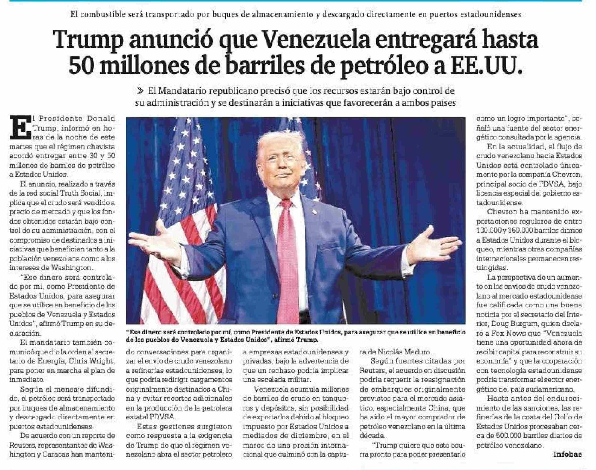 Trump anunció que Venezuela entregará hasta 50 millones de barriles de petróleo a EE.UU. 07-01-2026 La Prensa Austral |