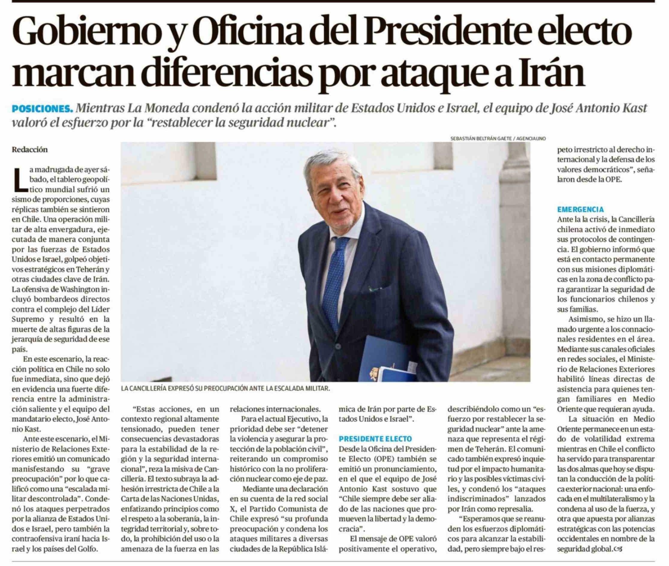 Gobierno y Oficina del Presidente electo marcan diferencias por ataque a Iran 01-03-2026 El Austral de Osorno |