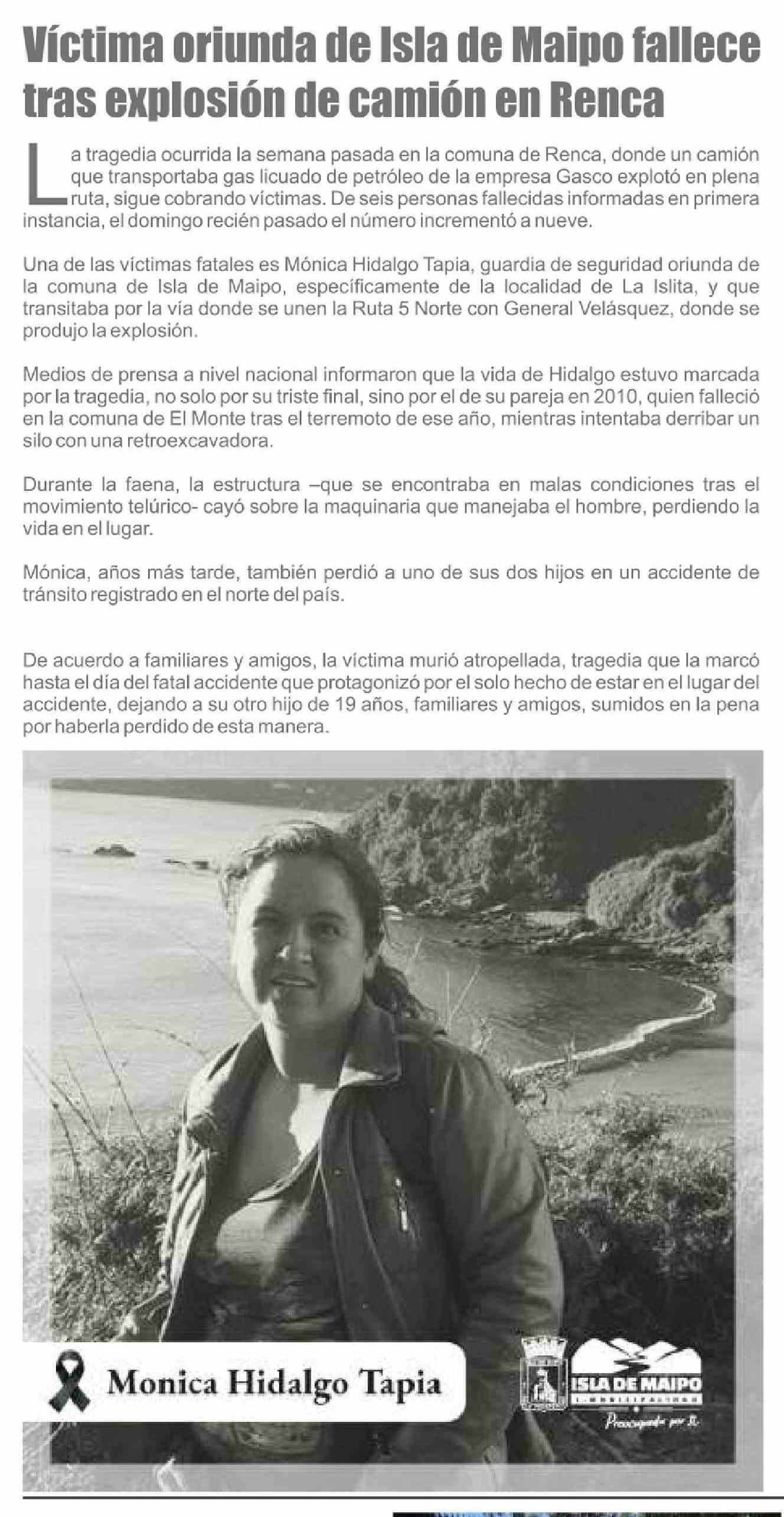 | Título: | Víctima oriunda de Isla de Maipo fallece tras explosión de camión en Renca |