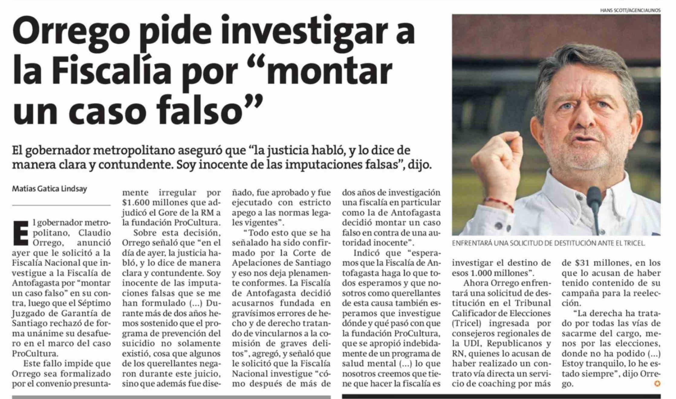 Título: Orrego pide investigar a la Fiscalía por "montar un caso falso"
