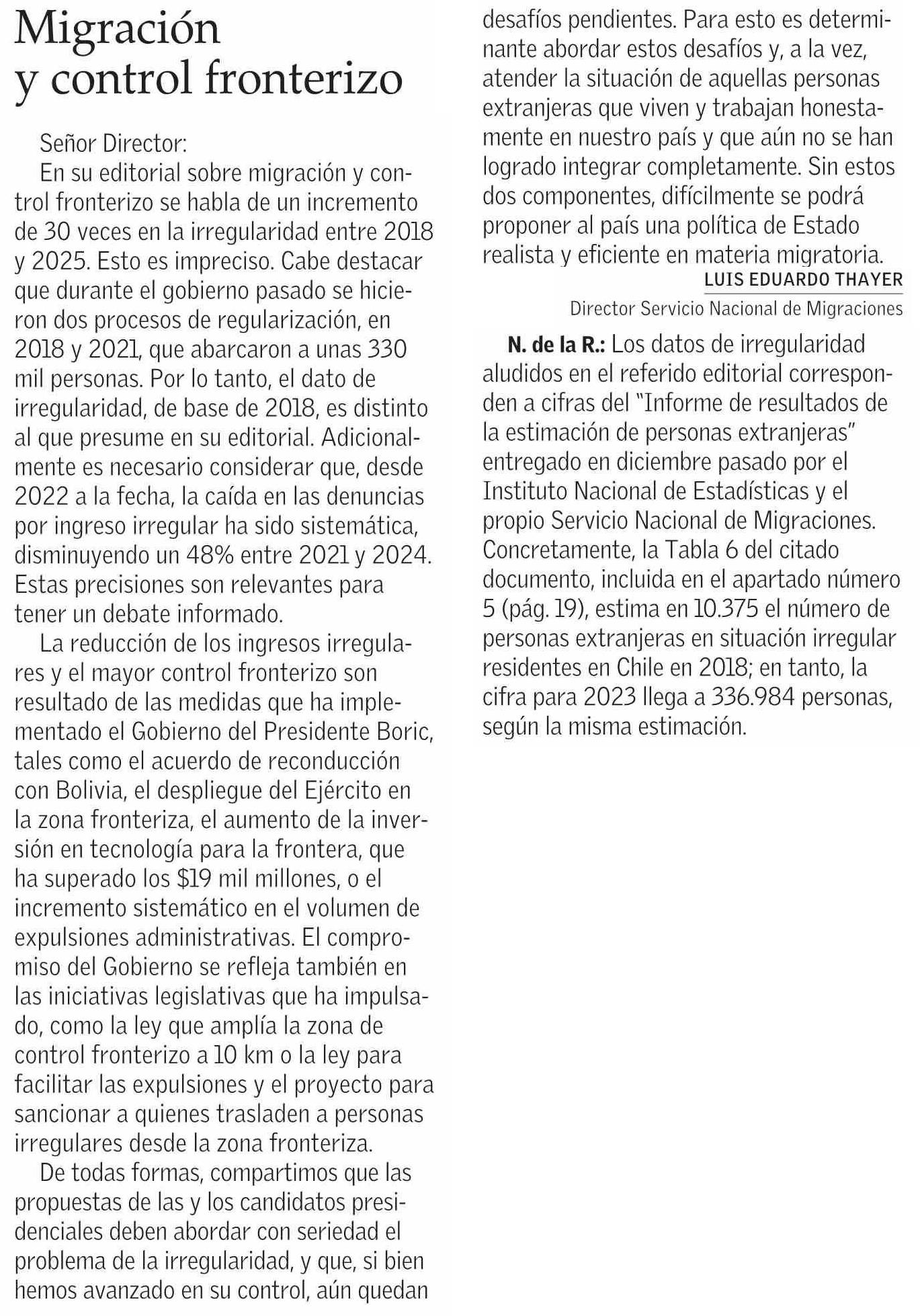CARTAS: Migración y control fronterizo 20-05-2025 El Mercurio |
