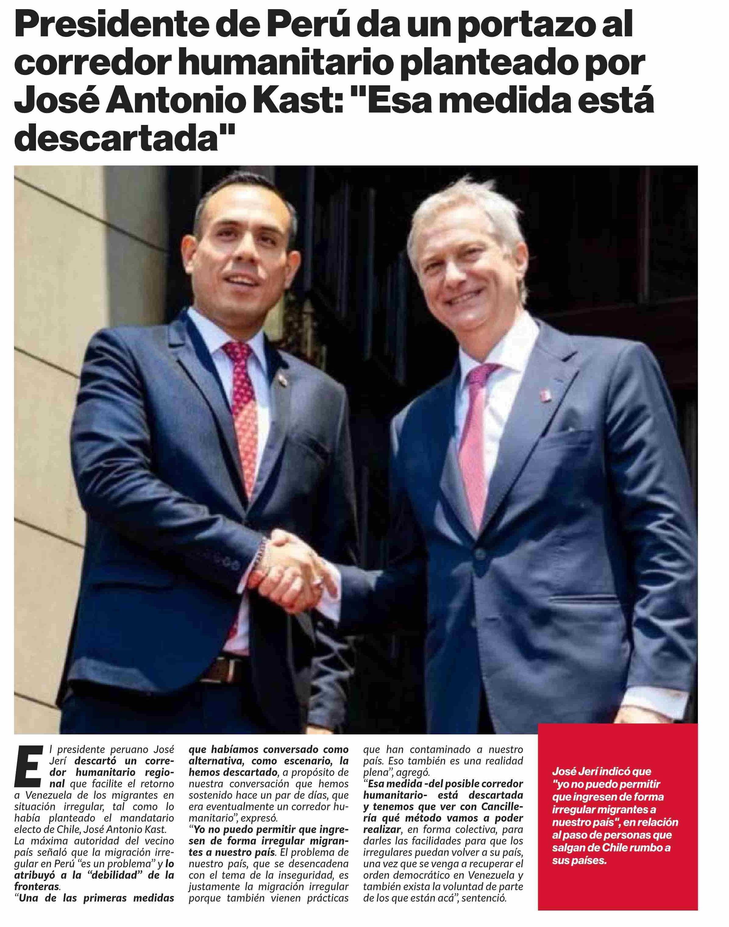 | Título: | Presidente de Perú da un portazo al corredor humanitario planteado por José Antonio Kast: “Esa medida está descartada” |