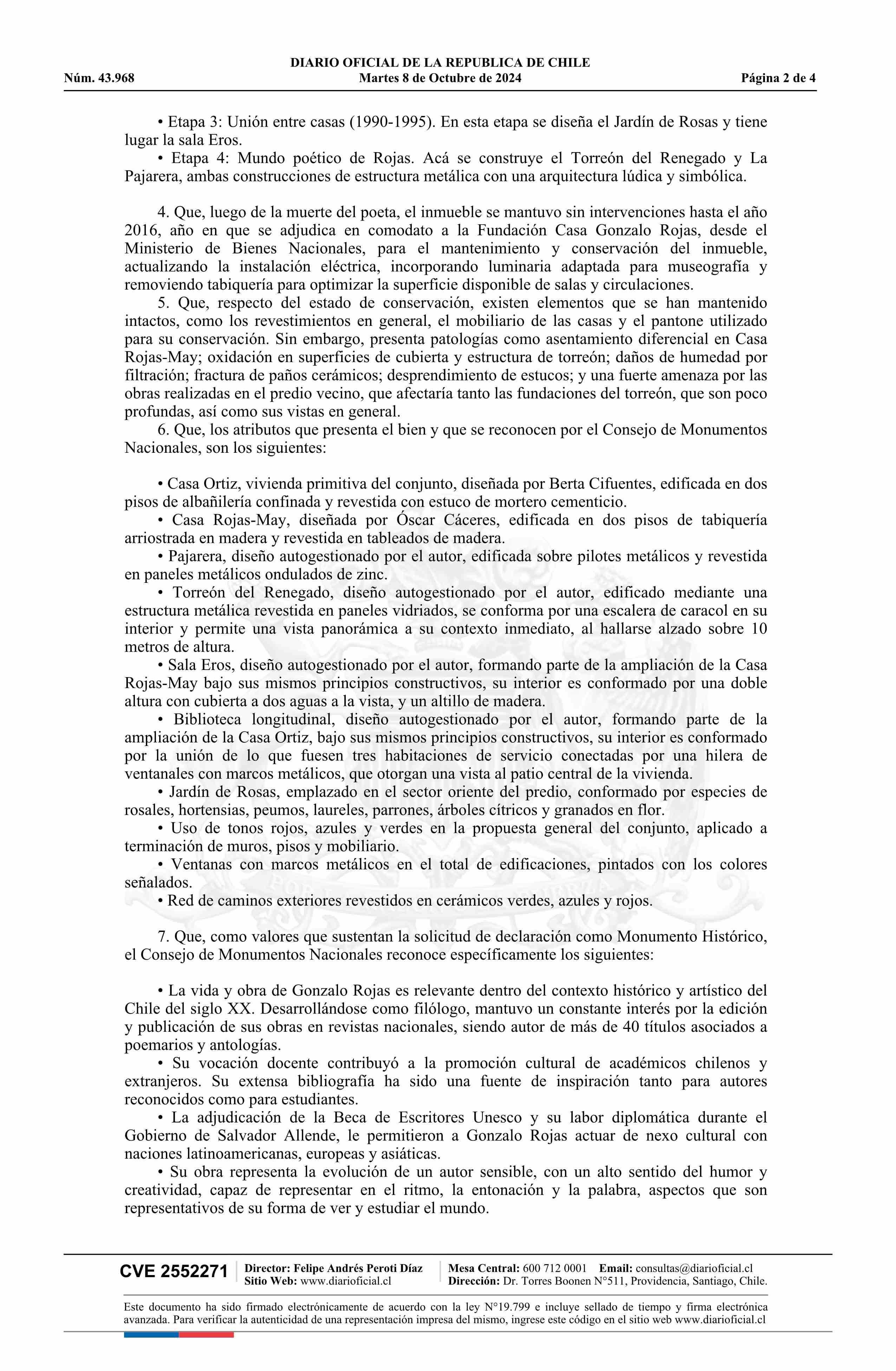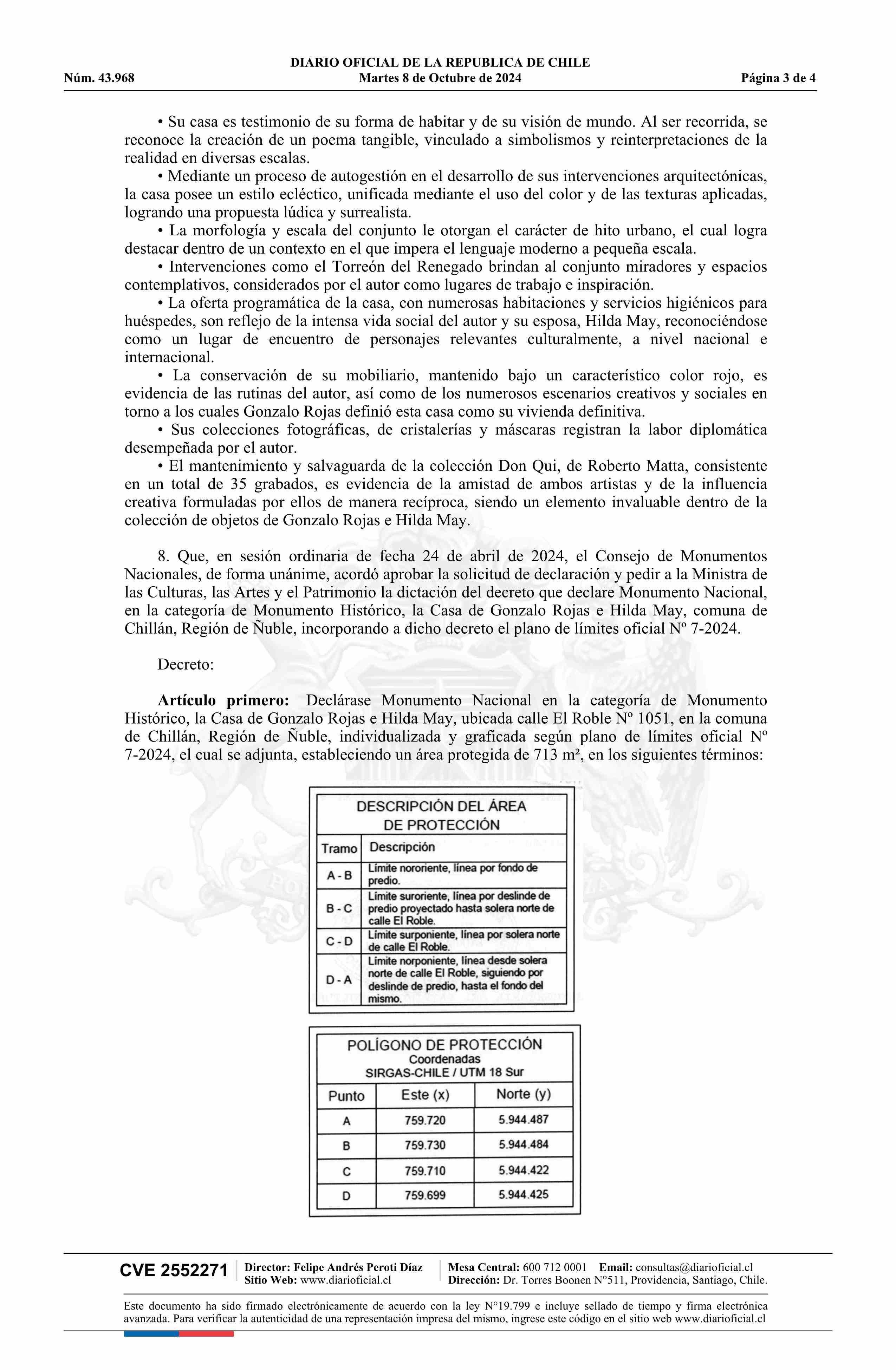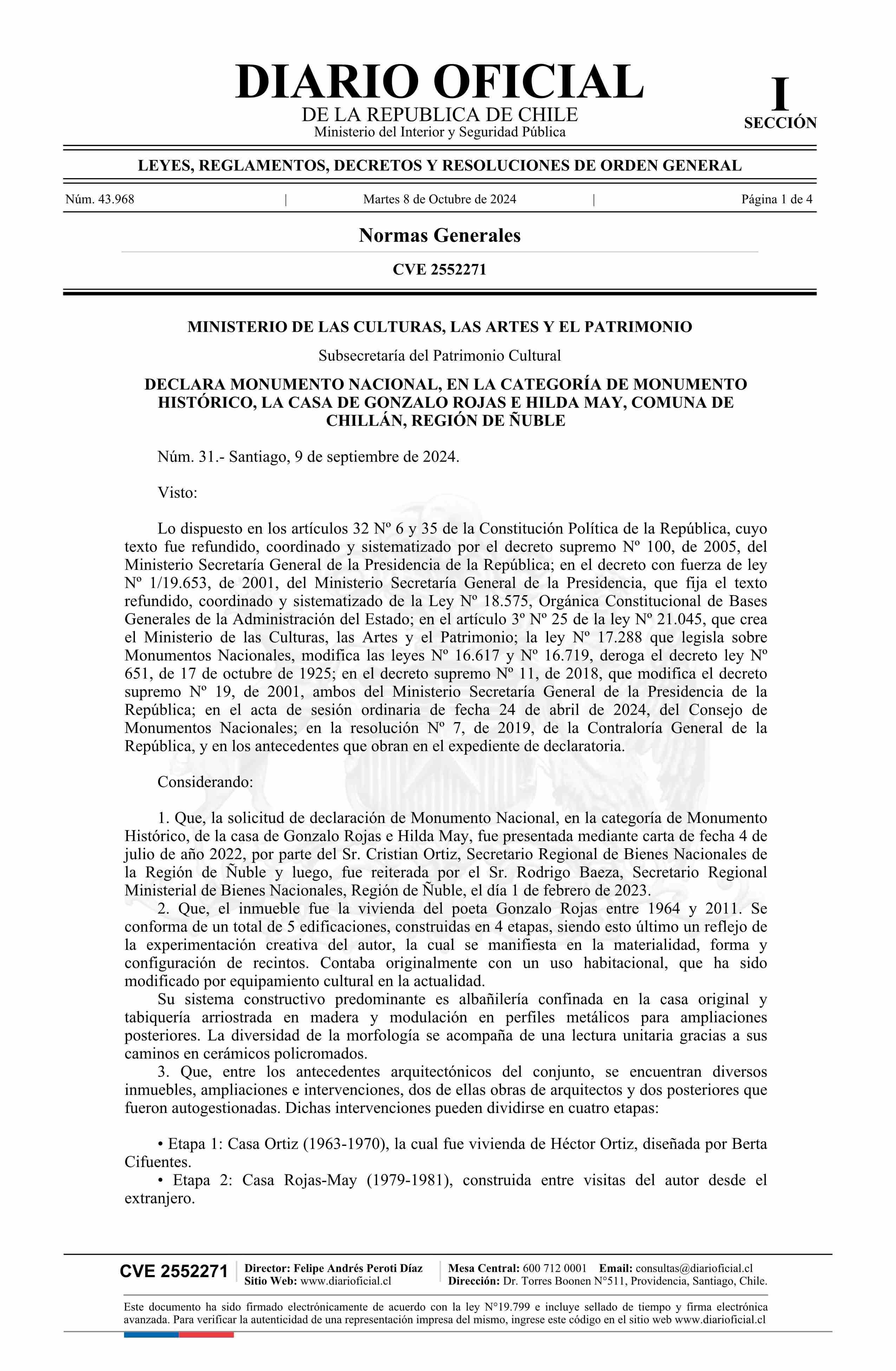 | Título: | Decreto número 31, de 2024.- Declara Monumento Nacional, en la categoría de Monumento Histórico, la Casa de Gonzalo Rojas e Hilda May, comuna de Chillán, Región de Ñuble |