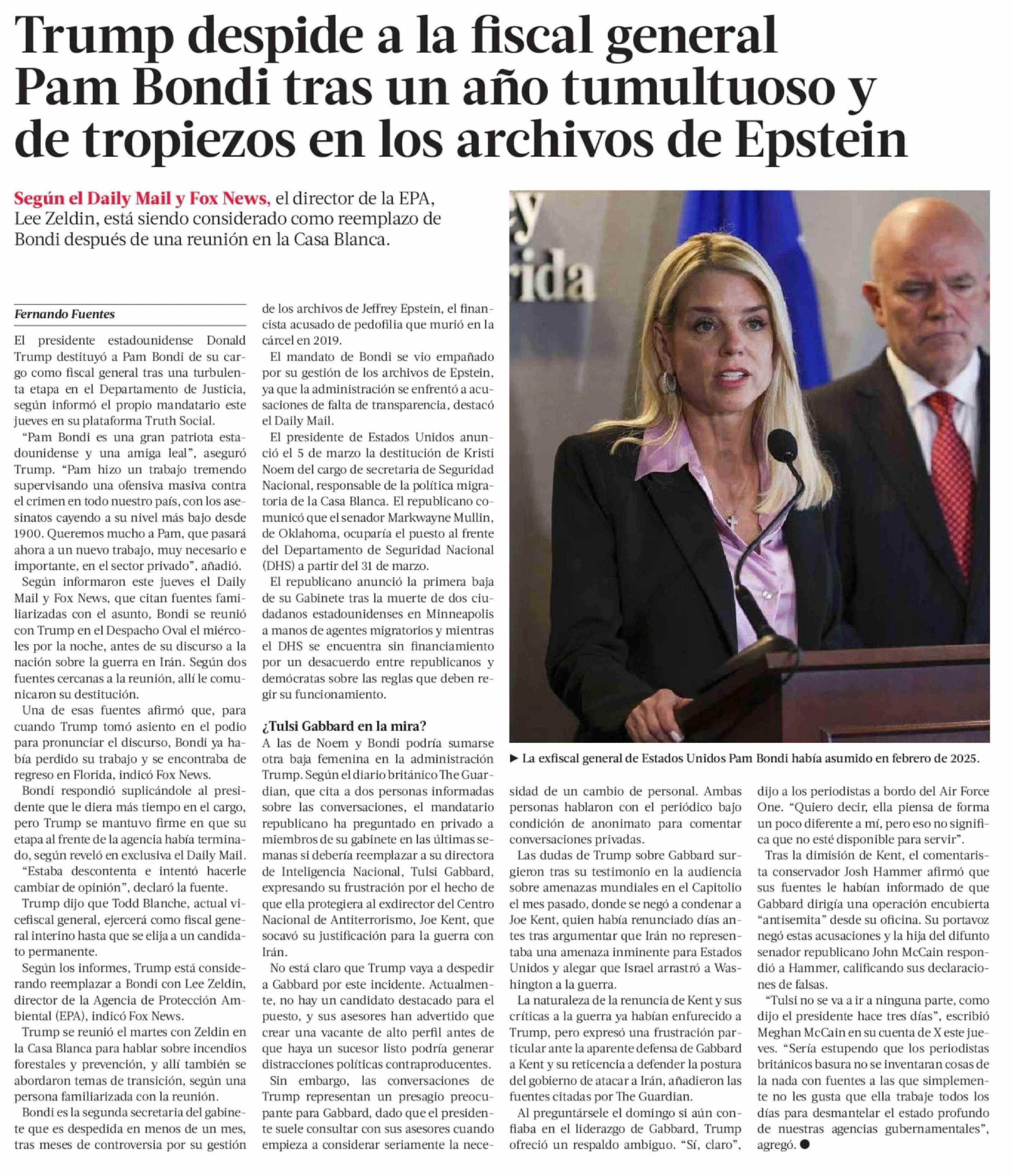 Título: Trump despide a la fiscal general Pam Bondi tras un año tumultuoso y de tropiezos en los archivos de Epstein