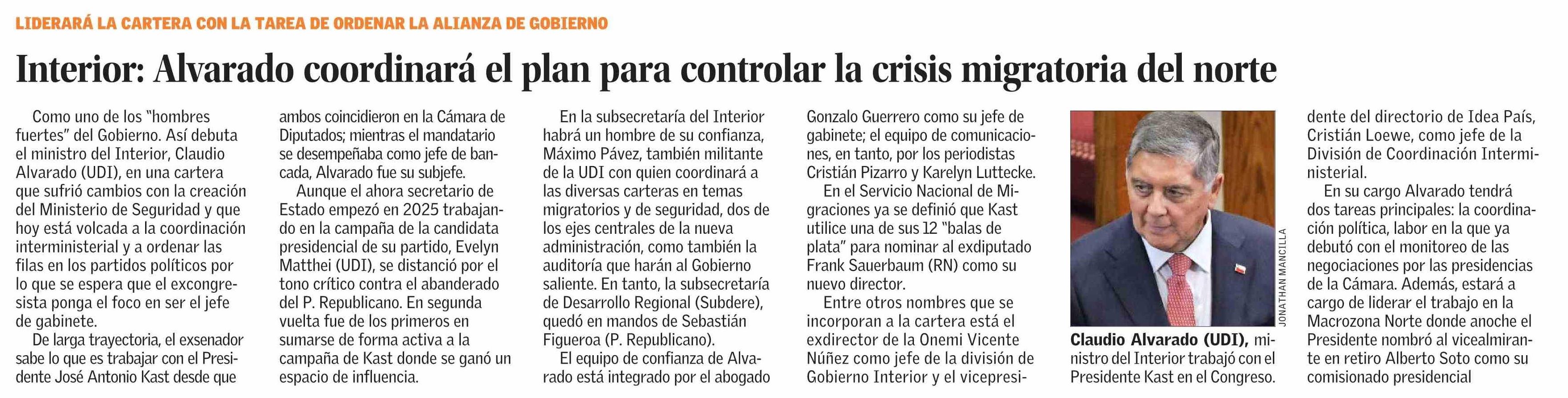 Interior: Alvarado coordinará el plan para controlar la crisis migratoria del norte 12-03-2026 El Mercurio |