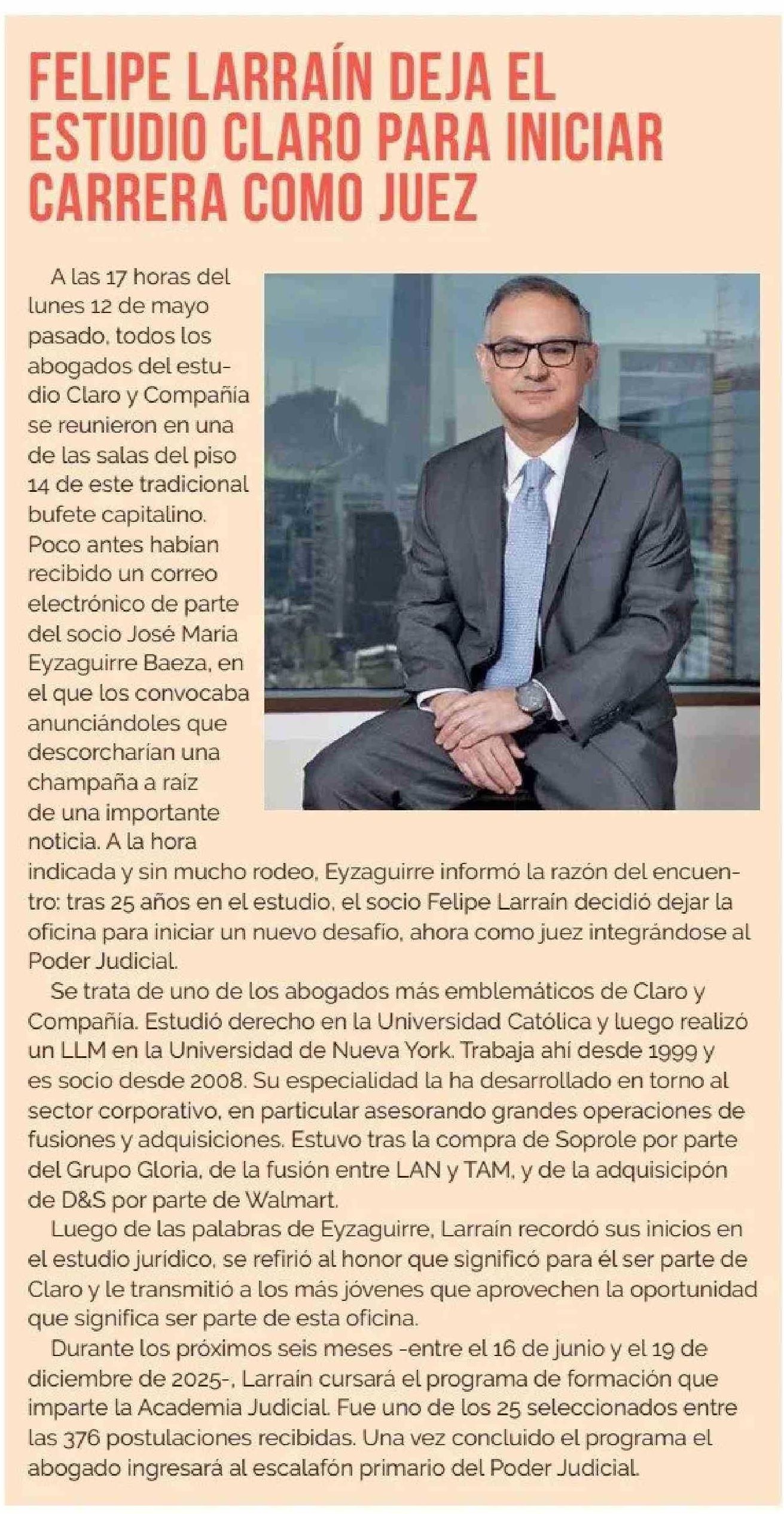 FELIPE LARRAÍN DEJA EL ESTUDIO CLARO PARA INICIAR CARRERA COMO JUEZ 18-05-2025 Diario Financiero |