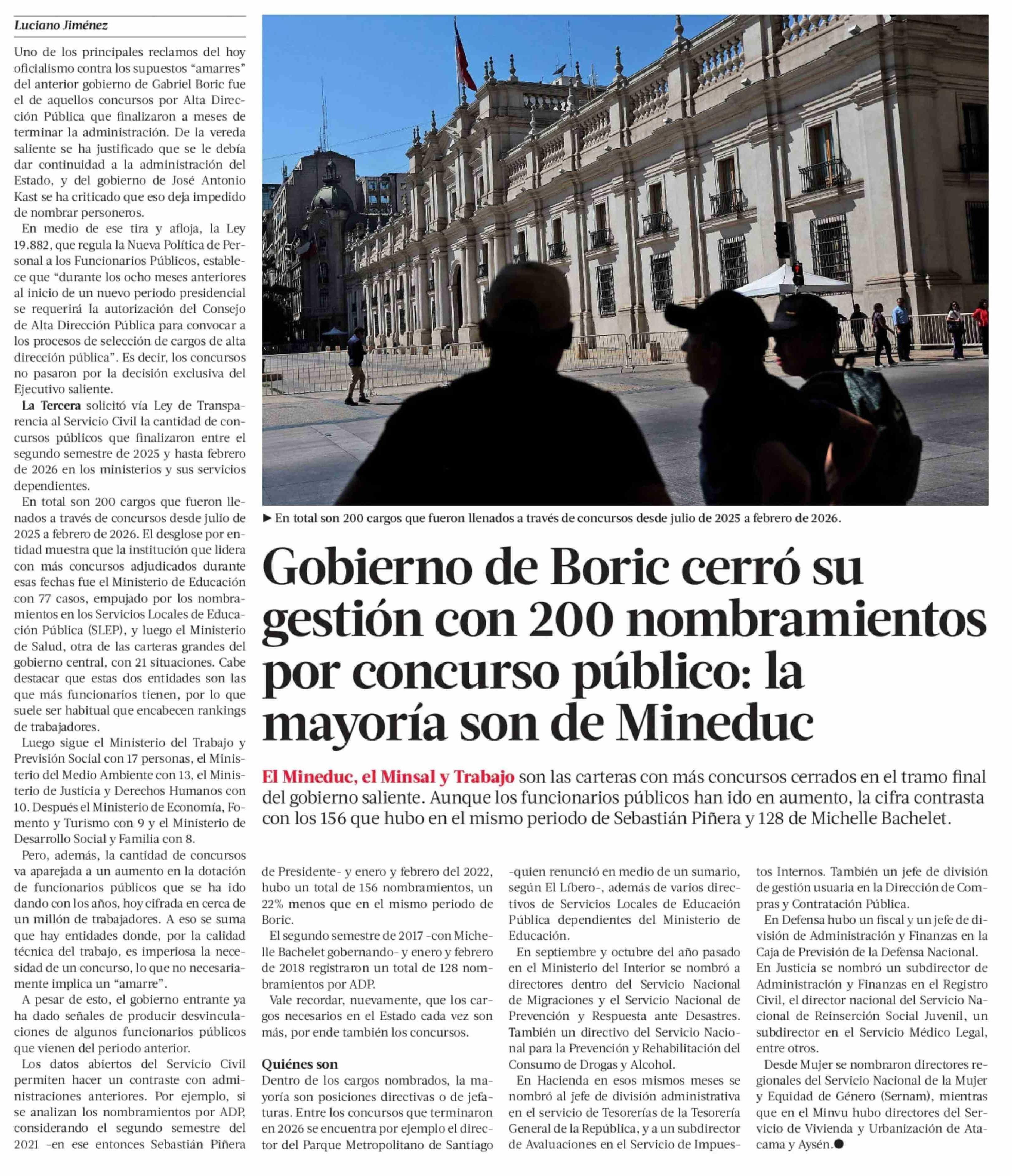 Gobierno de Boric cerró su gestión con 200 nombramientos por concurso público: la mayoría son de Mineduc 19-03-2026 La Tercera |