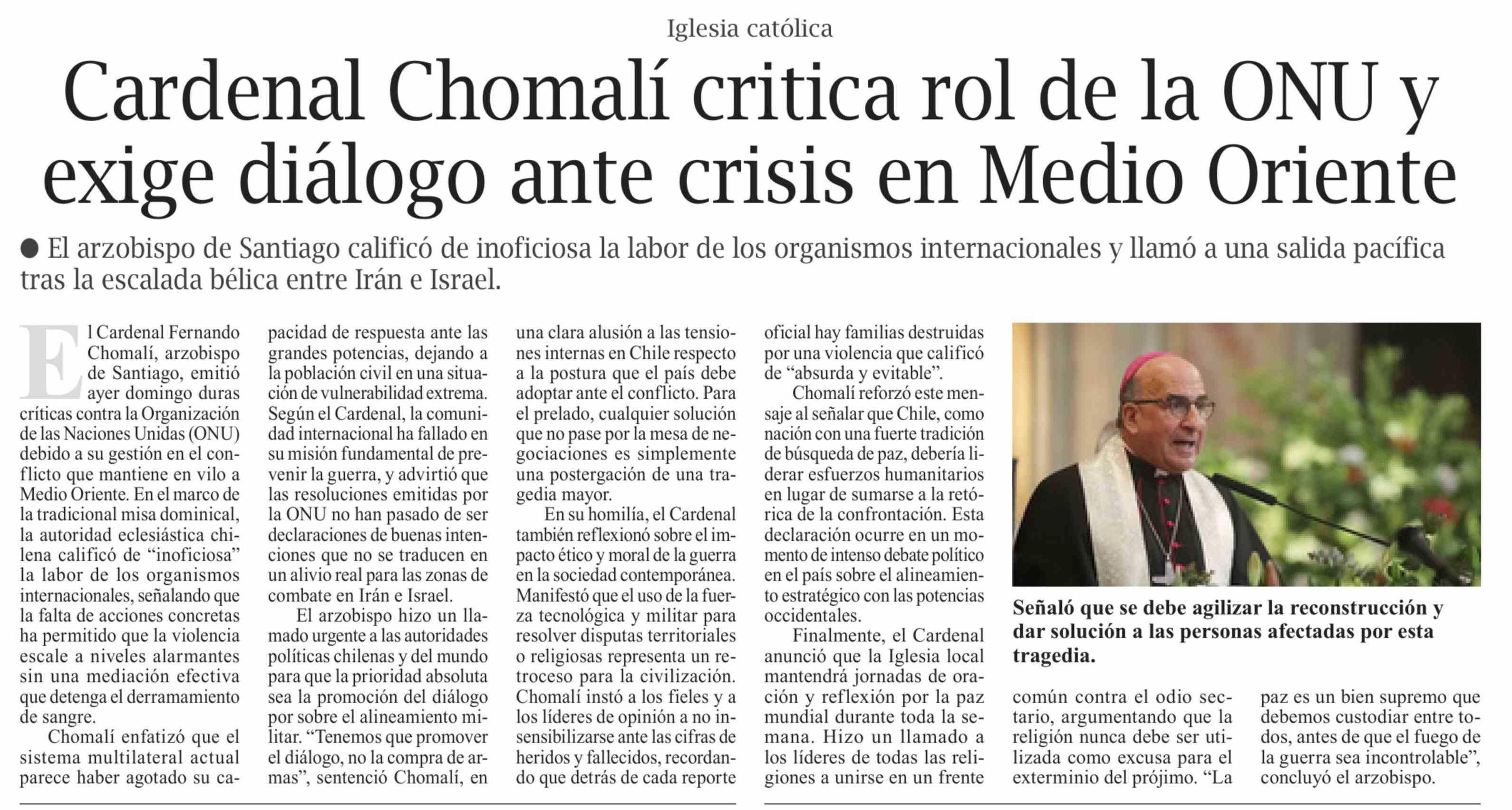 | Título: | Cardenal Chomalí critica rol de la ONU y exige diálogo ante crisis en Medio Oriente |