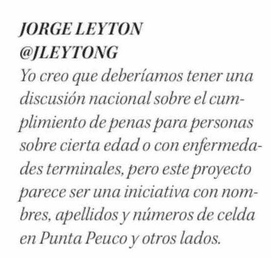 | Título: | JORGE LEYTON @JLEYTONG Yo creo que deberíamos tener una discusión nacional sobre el cumplimiento de penas para personas sobre cierta edad o con enfermedades terminales, pero este proyecto parece ser una iniciativa con nombres, apellidos y números de celda en Punta Peuco y otros lados. |