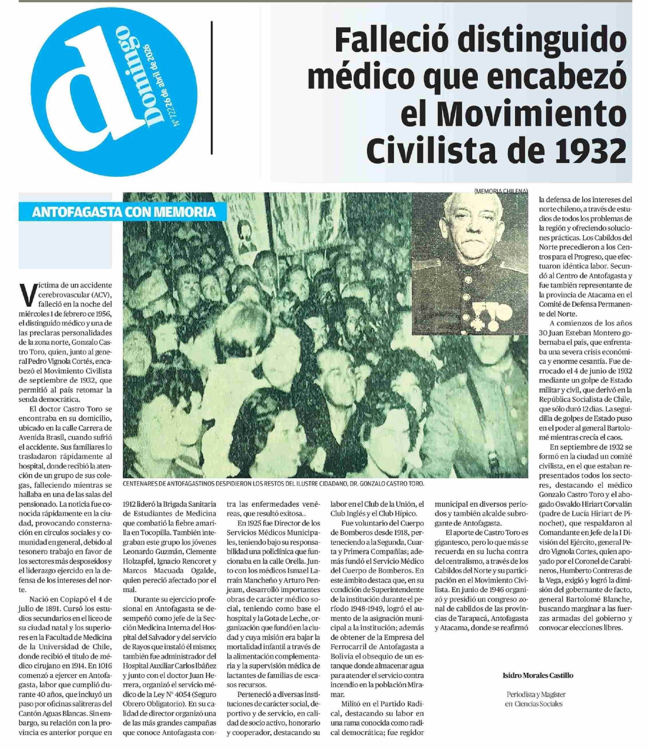 Falleció distinguido médico que encabezó el Movimiento Civilista de 1932 26-04-2026 El Mercurio de Antofagasta |
