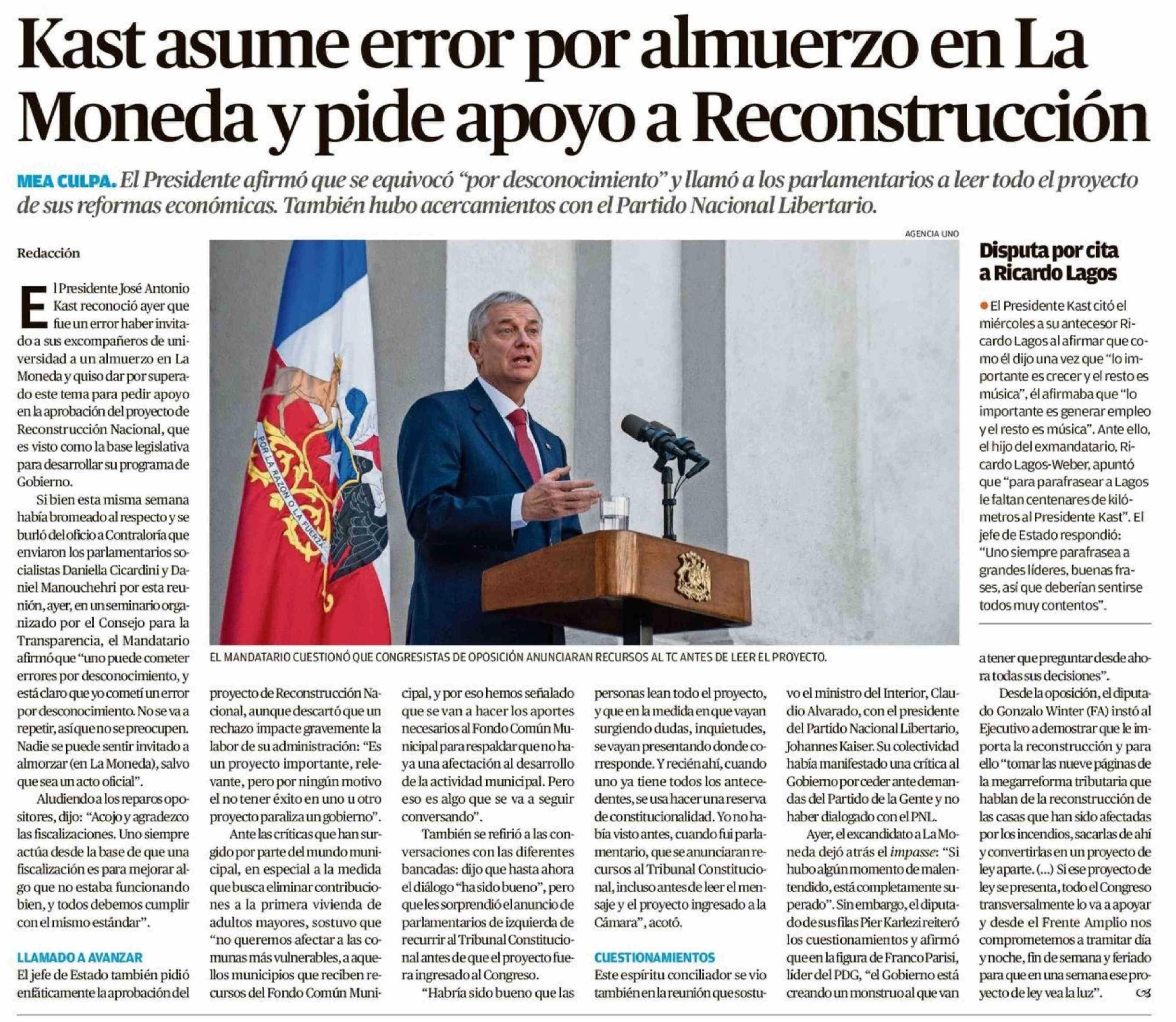 Kast asume error por almuerzo en La Moneda y pide apoyo a Reconstrucción 25-04-2026 El Mercurio de Valparaíso |