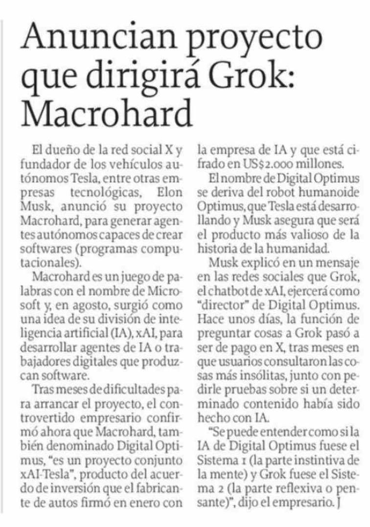 Anuncian proyecto que dirigirá Grok: Macrohard 14-03-2026 El Sur |