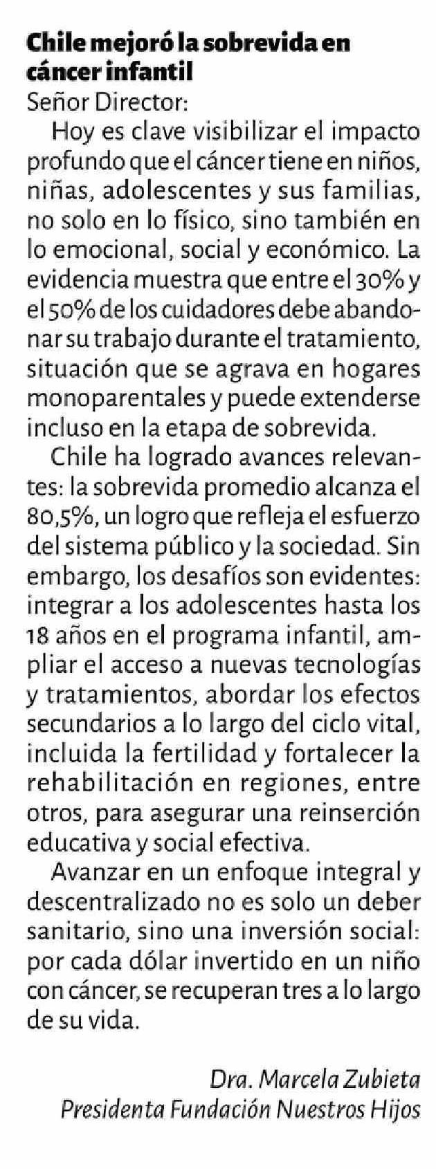 CARTAS: Chile mejoró la sobrevida en cáncer infantil 16-02-2026 La Discusión |