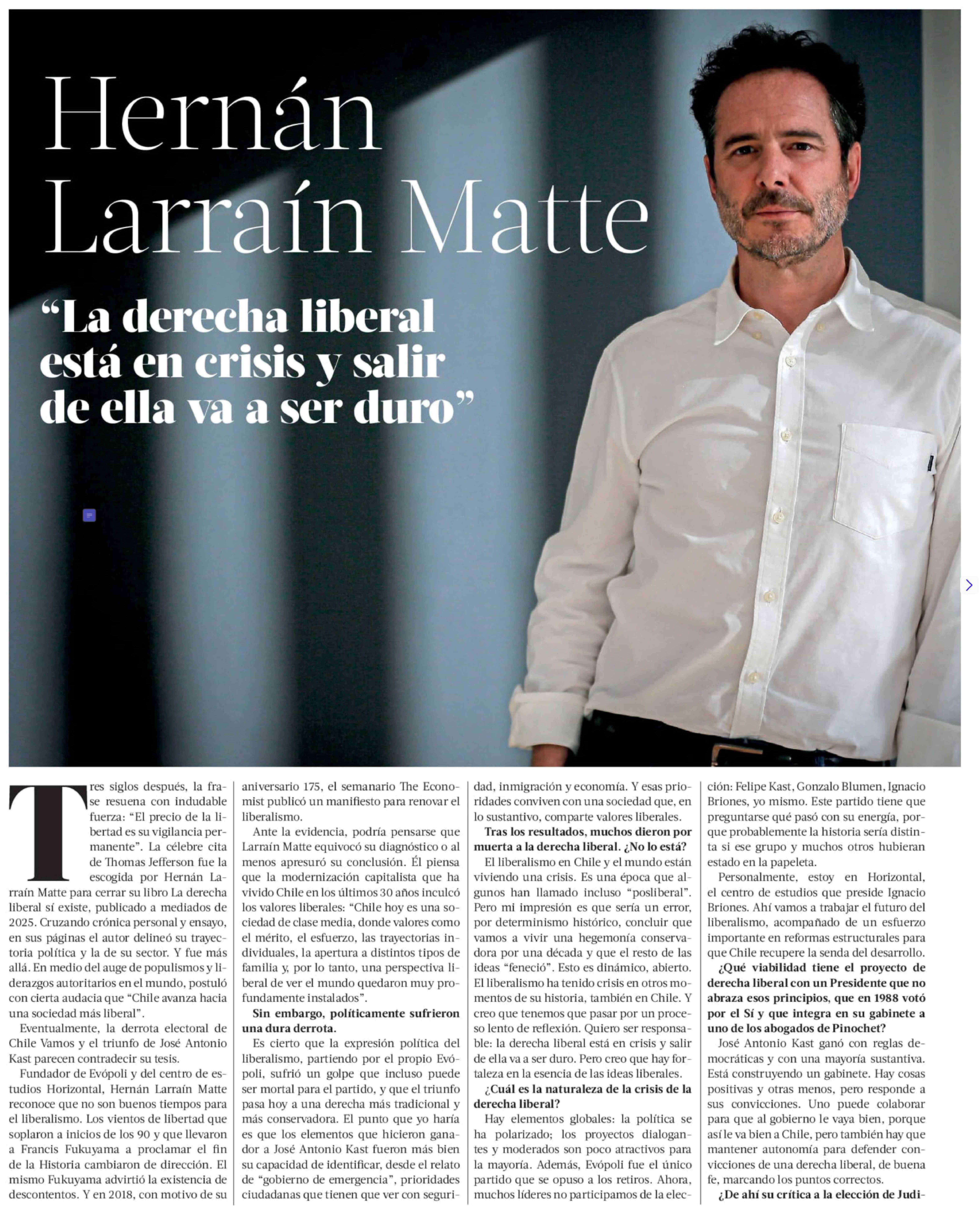 Hernán Larraín Matte "La derecha liberal está en crisis y salir de ella va a ser duro" 01-02-2026 La Tercera |