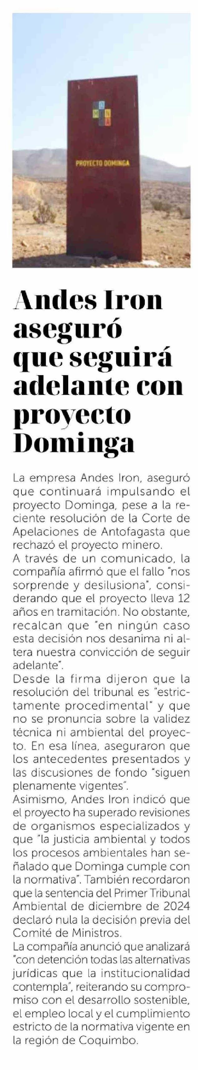 | Título: | Andes Iron aseguró que seguirá adelante con proyecto Dominga |