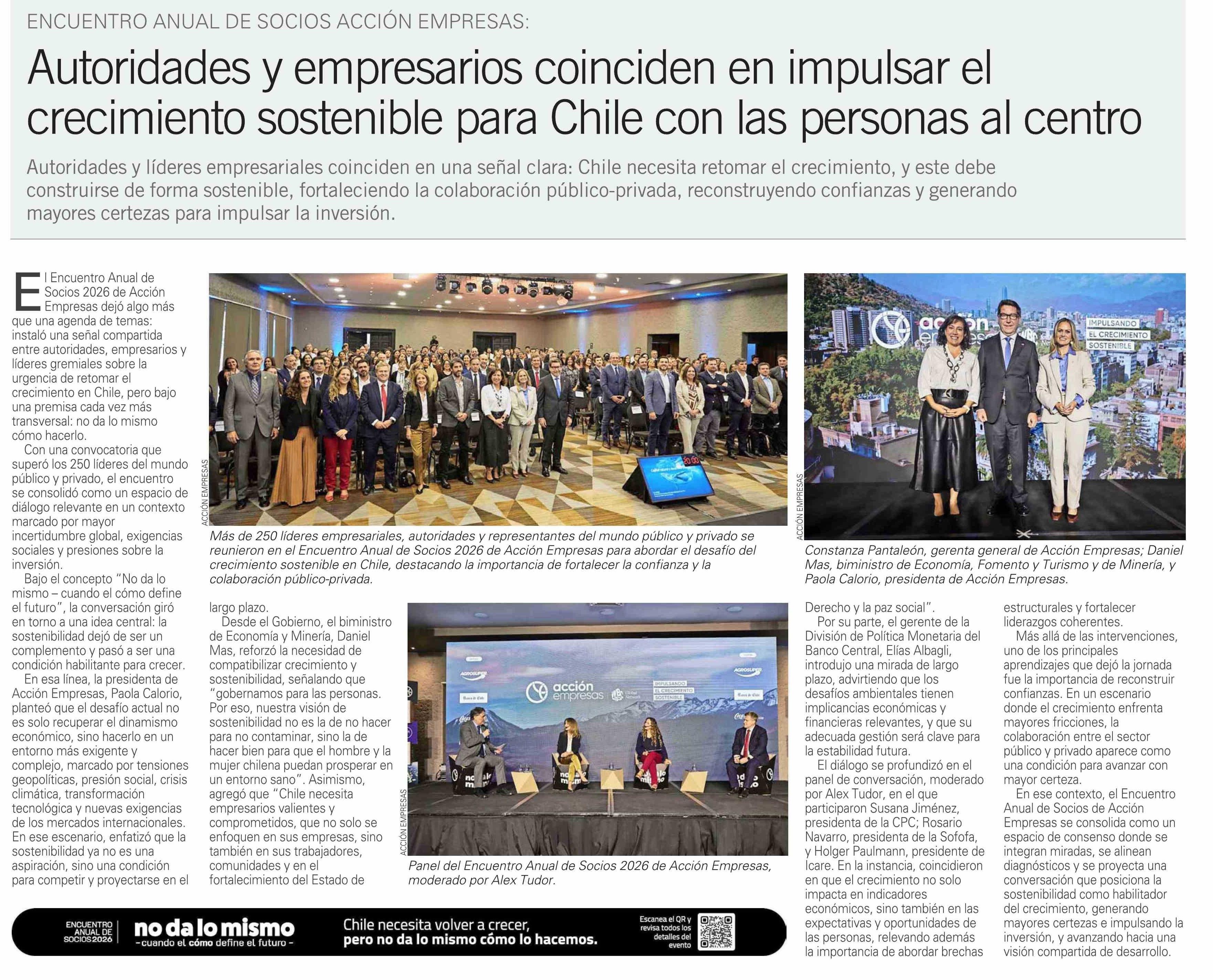 Título: Autoridades y empresarios coinciden en impulsar el crecimiento sostenible para Chile con las personas al centro