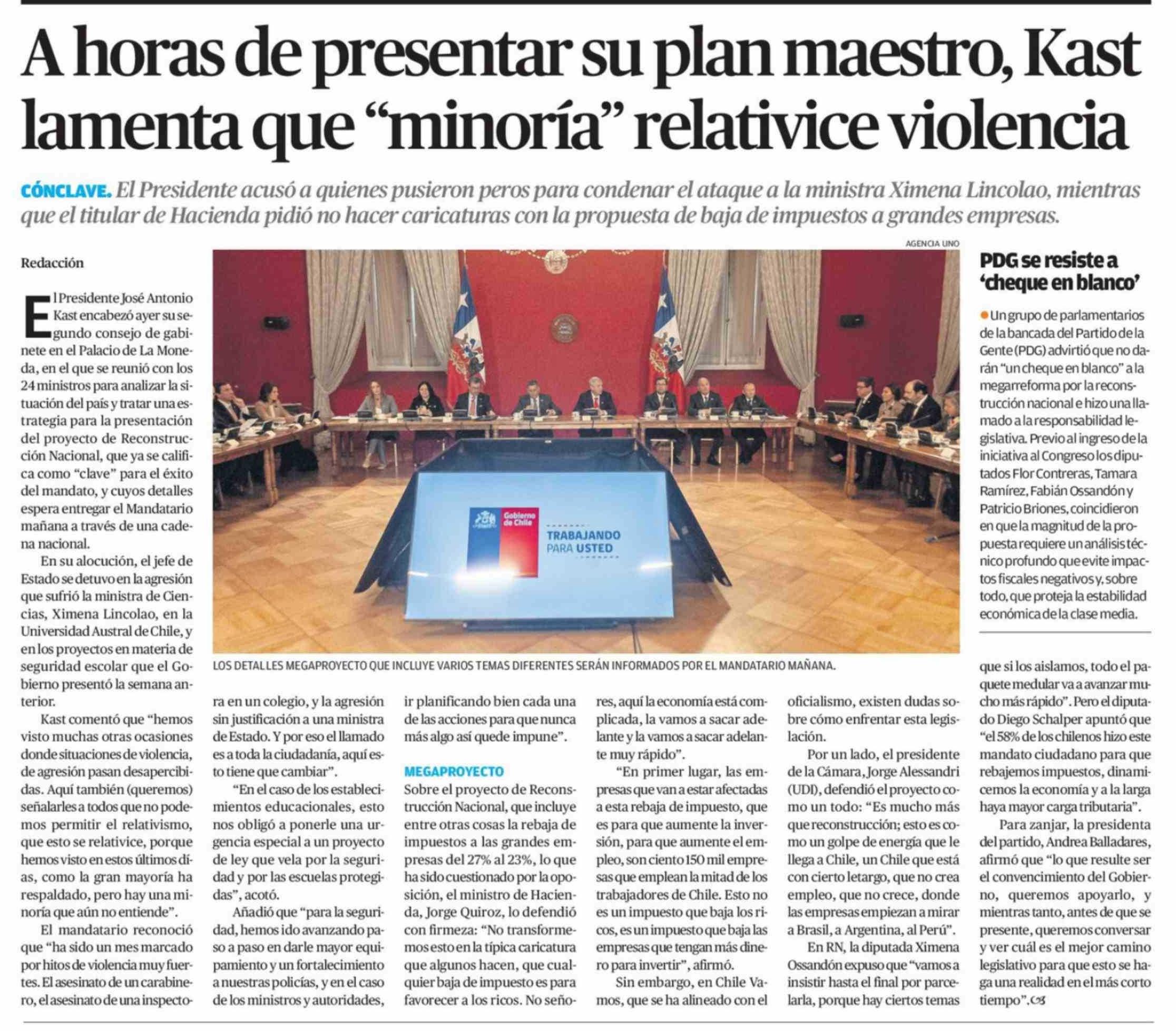 Título: A horas de presentar su plan maestro, Kast lamenta que "minoría" relativice violencia