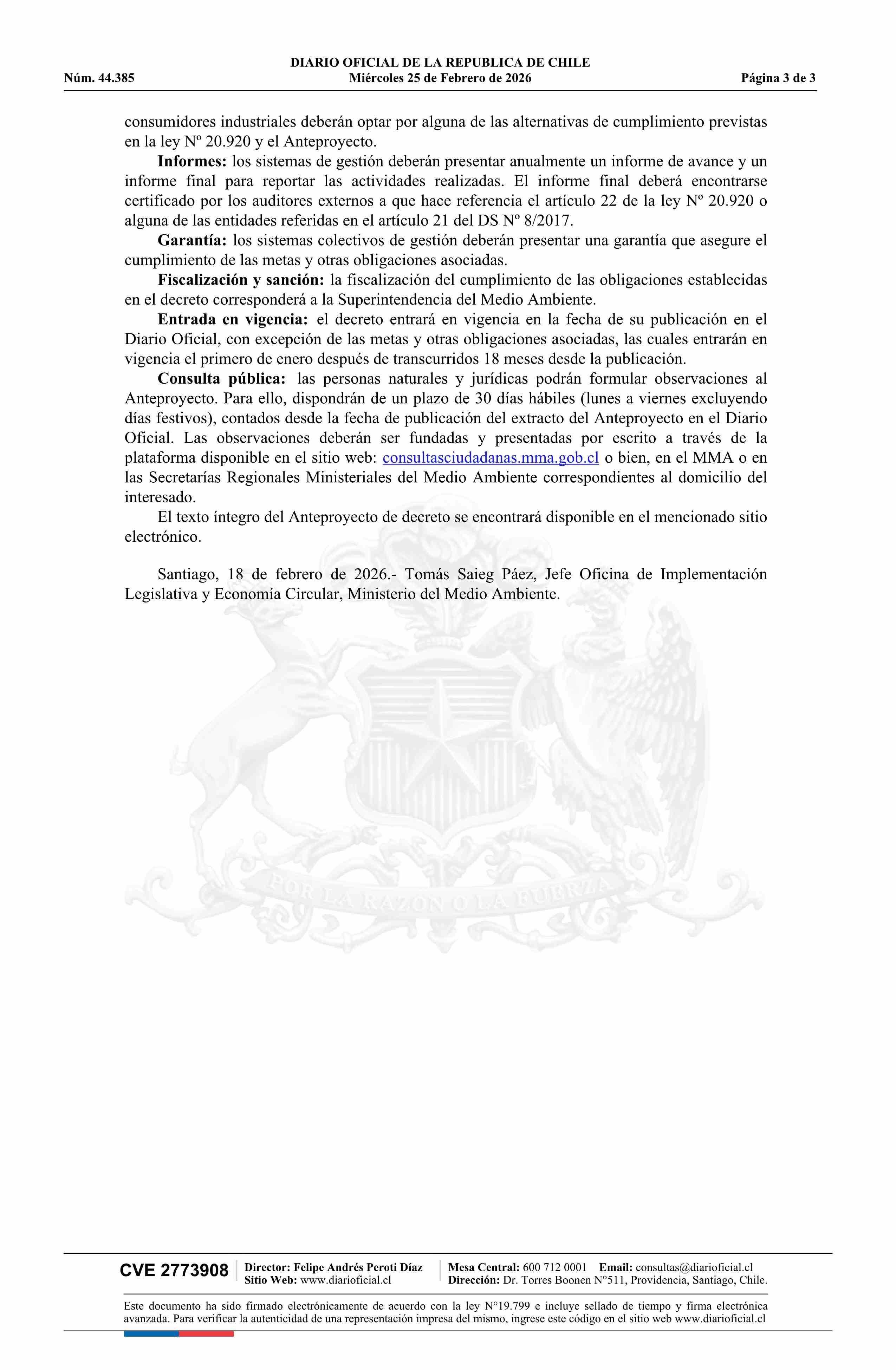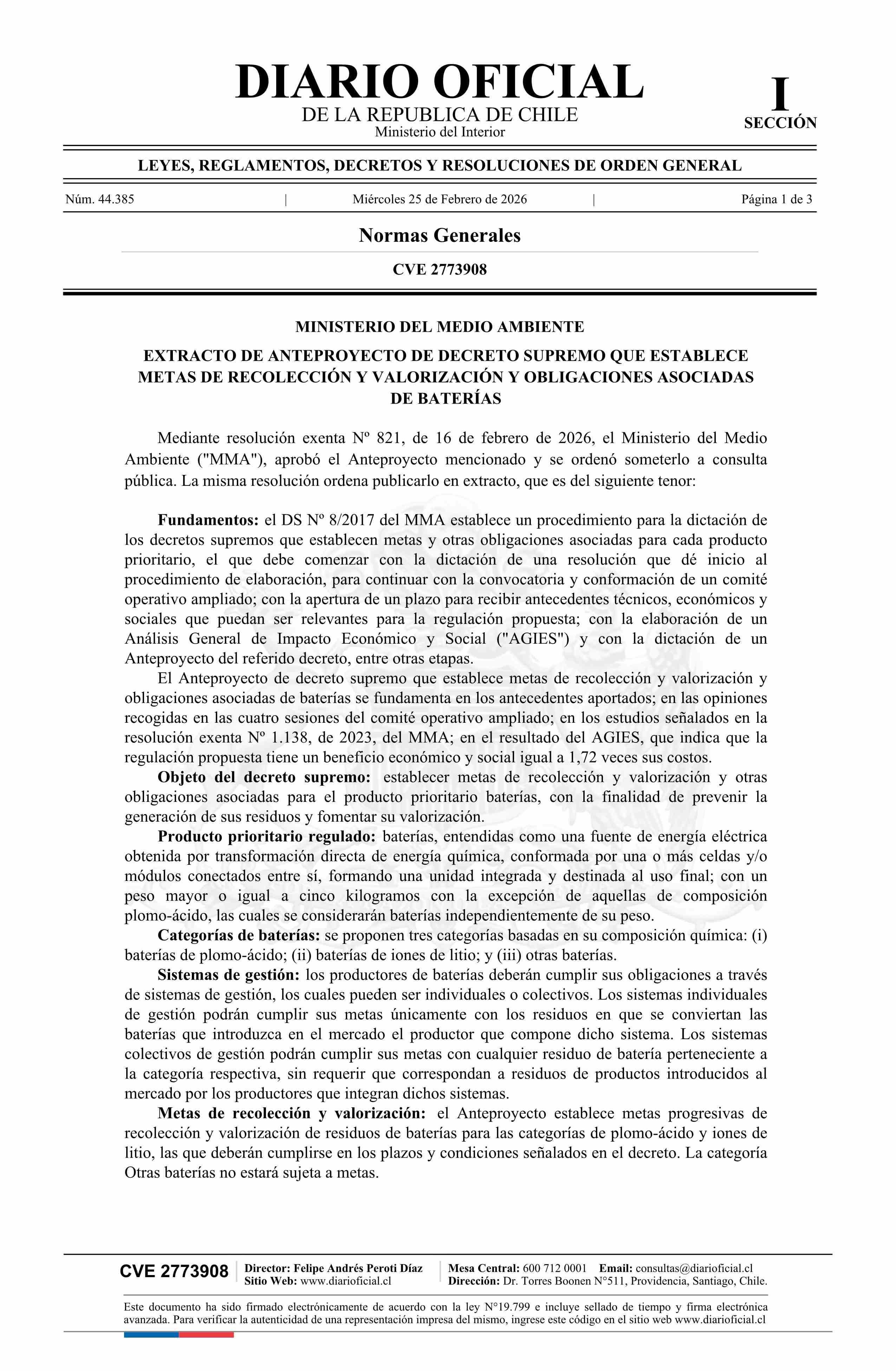 Título: Extracto de resolución exenta número 821, de 2026.- Aprueba anteproyecto de decreto que establece metas de recolección y valorización y obligaciones asociadas de baterías, y lo somete a consulta pública