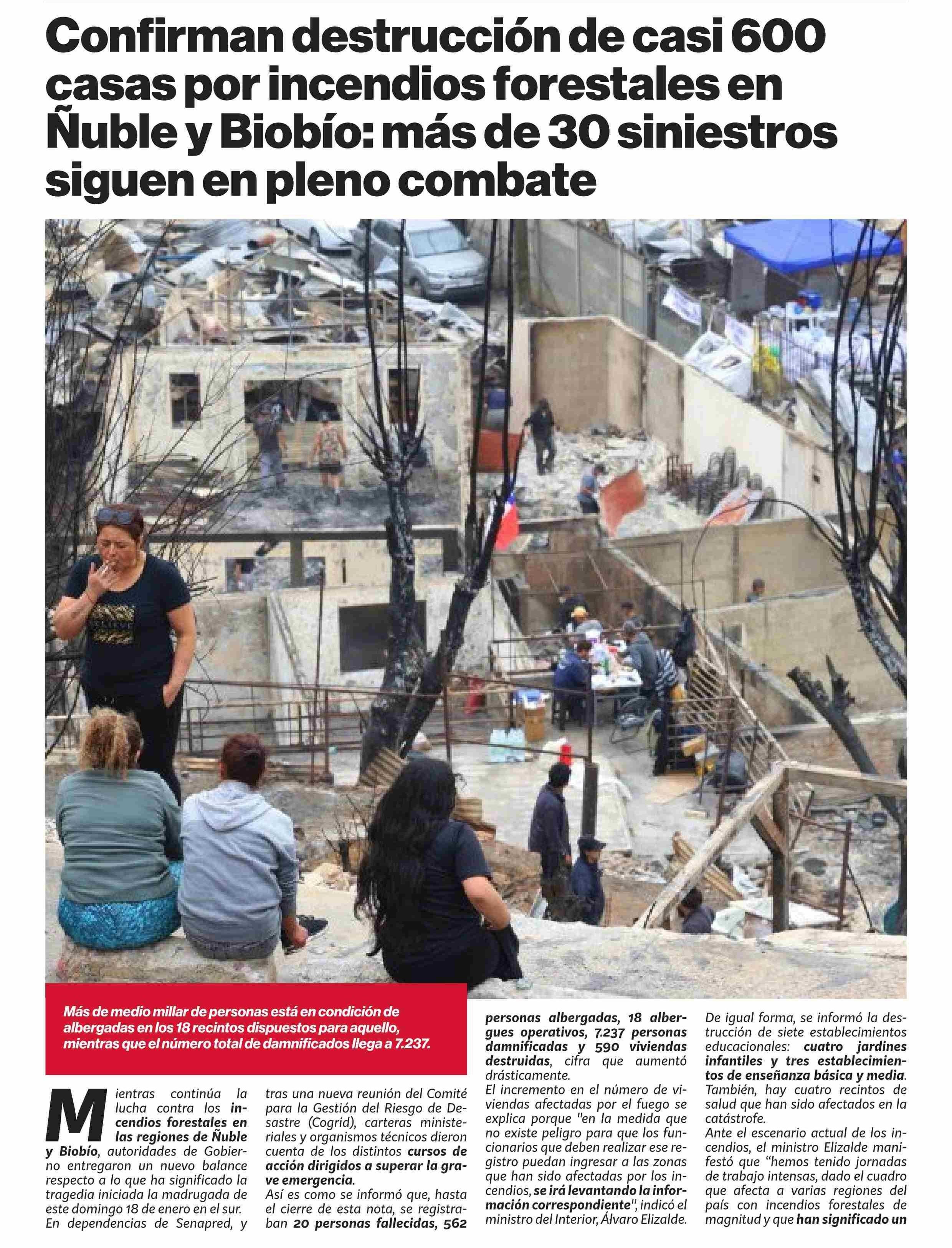 Título: Confirman destrucción de casi600 casas por incendios forestales en Ñuble y Biobío: más de 30 siniestros siguen en pleno combate