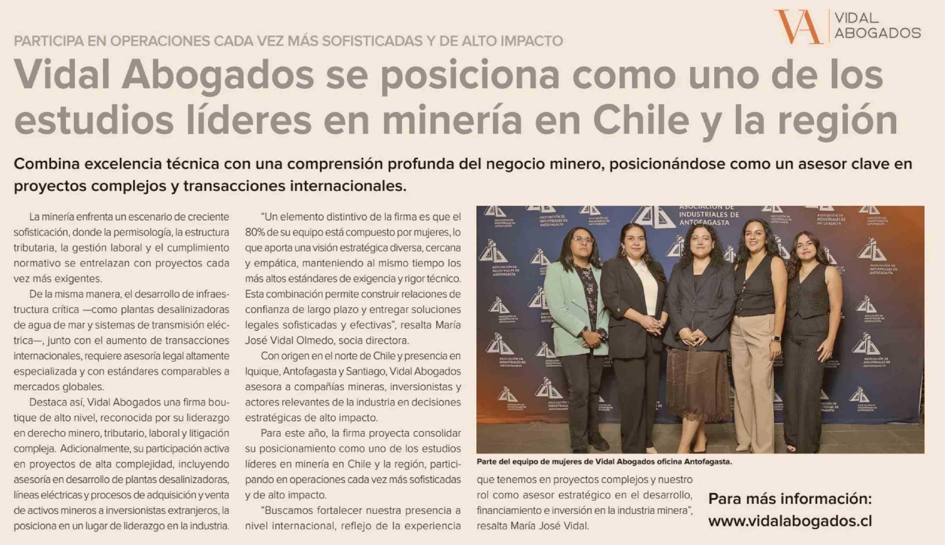 Título: Vidal Abogados se posiciona como uno de los estudios líderes en minería en Chile y la región