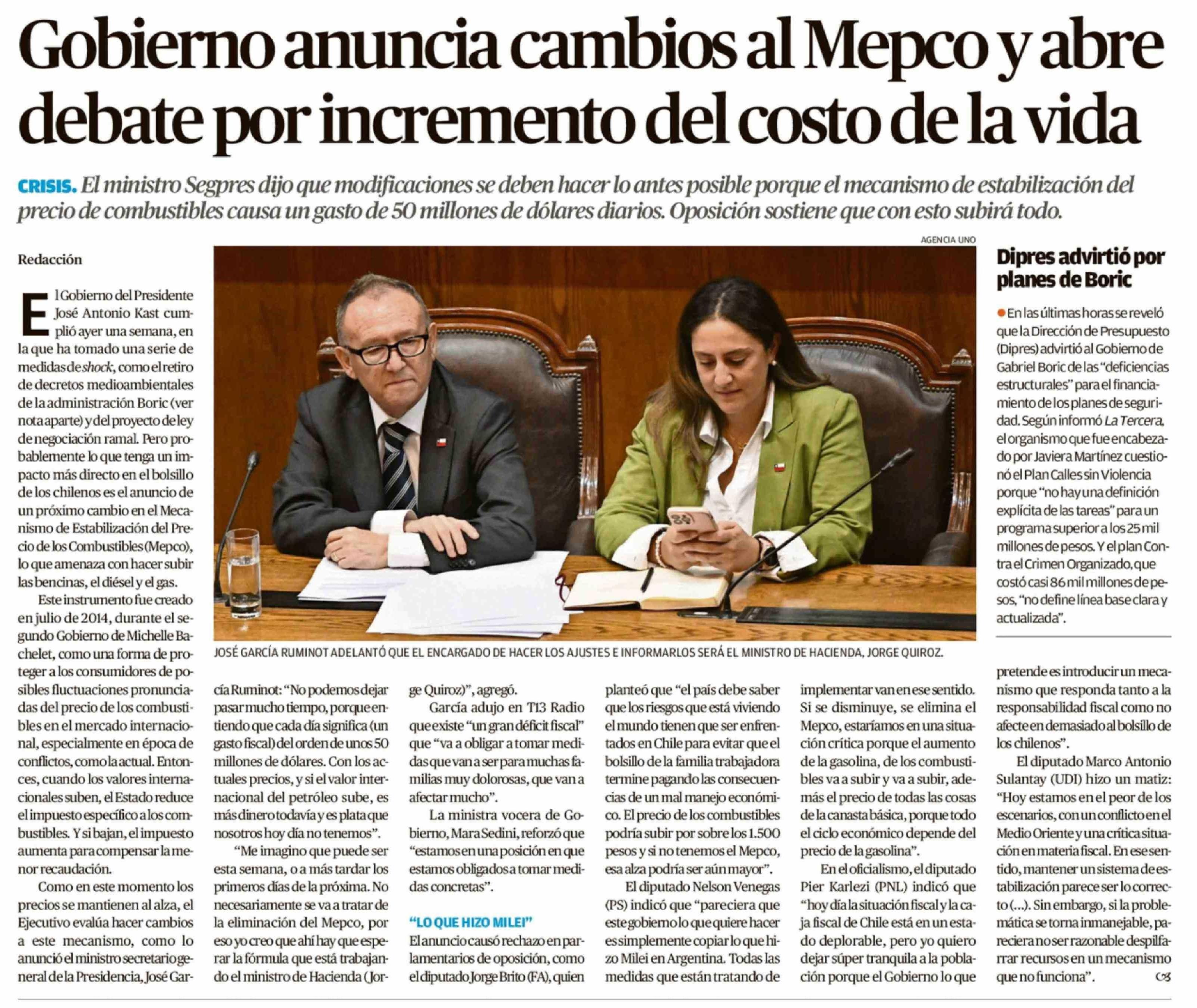 Gobierno anuncia cambios al Mepco y abre debate por incremento del costo de la vida 19-03-2026 El Mercurio de Valparaíso |