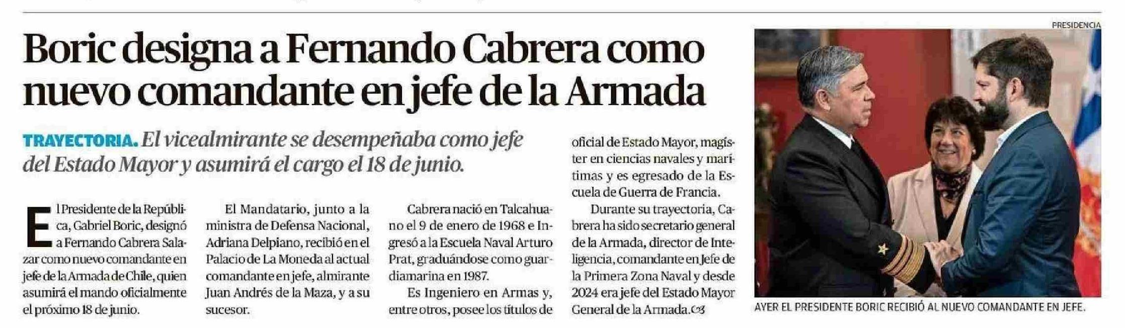 Boric designa a Fernando Cabrera como nuevo comandante en jefe de la Armada 07-06-2025 Crónica de Chillán |
